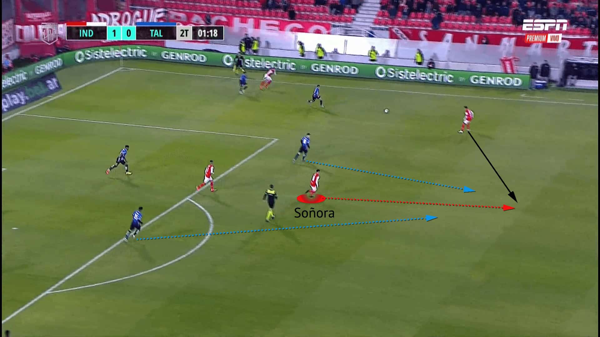 Soñora’s movement is crucial for both ball retention and progression, actively looking to sustain possession and picking up smart positions create overloads. With Independiente’s wide players having a major role in possession, dominating the wide areas can allow the team to gain control. They can do this by overloading the wide areas. In the figure below, Soñora has drifted to the right-wing to create a 4vs3 in the widest channel. Receiving between the lines, he has pulled out the Talleres left-back. The defensive perturbation caused by Soñora’s movement has created space for his teammate up the channel to receive in space and attack the underloaded Talleres defence.