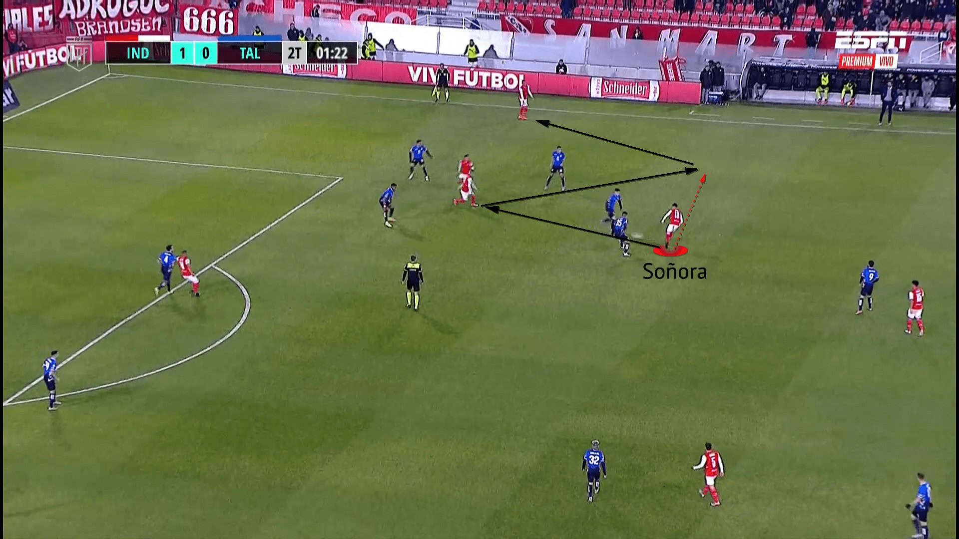 The figure above shows one of these scenarios at Independiente, with Soñora displaying his ability to accurately thread passes between the lines for the inverting winger. Soñora’s forward-thinking has sprung another up-back-through combination, with his weight of pass allowing the combination to occur with control.