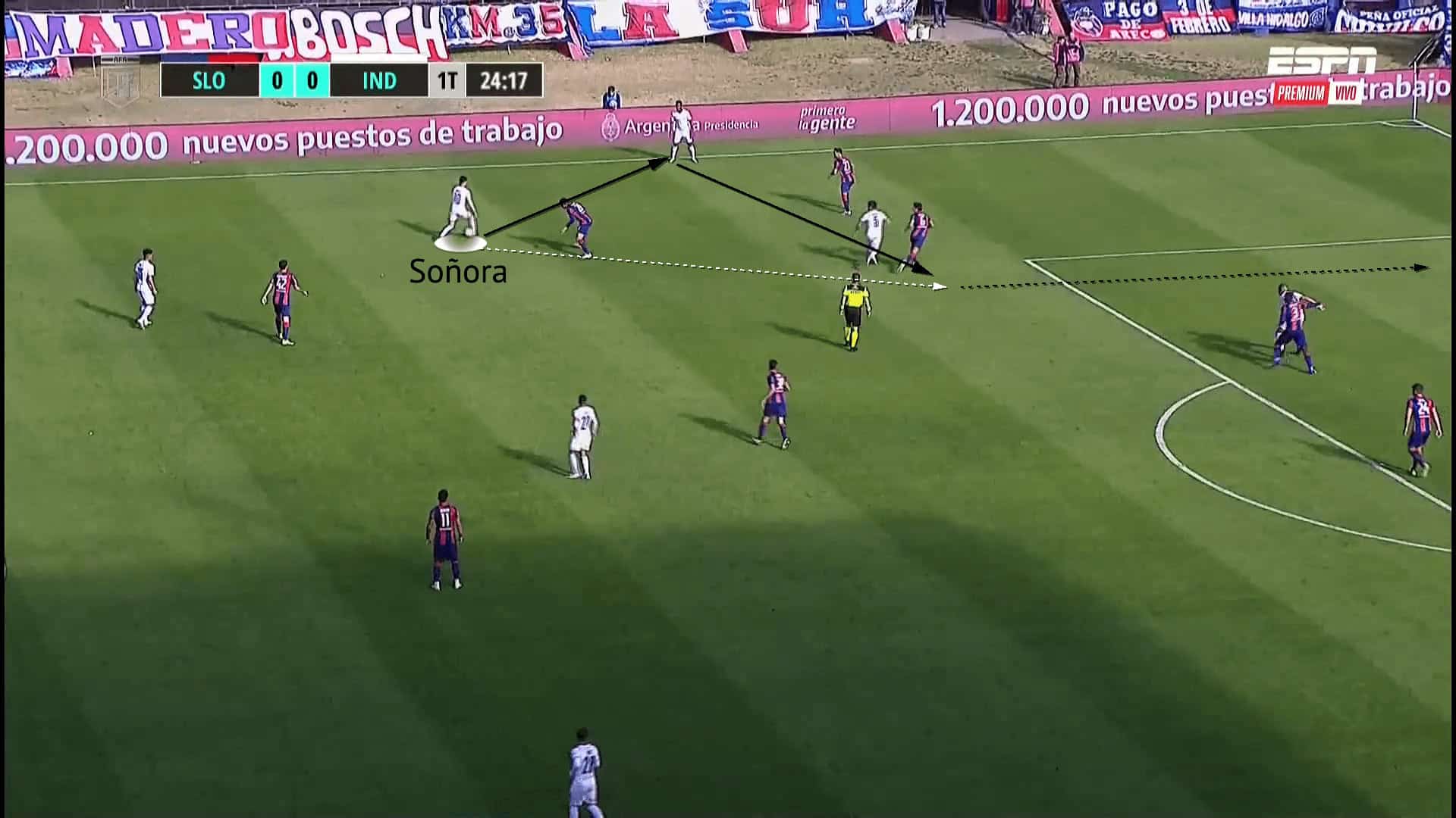 The figures above and below show an example of Soñora combining with Juan Cazares. Immediately after executing the pass, Soñora breaks beyond his marker to receive the return pass before dribbling into the opposition penalty box. Using his impressive ball manipulation, he has left the tracking opponent on the floor and created separation to play a cut-back to the edge of the box. The cut-back was slightly underhit, resulting in the teammates shot being promptly blocked.