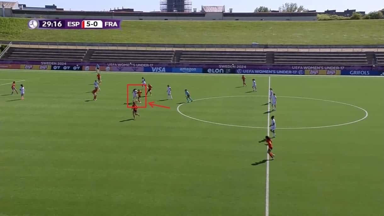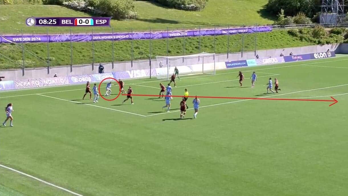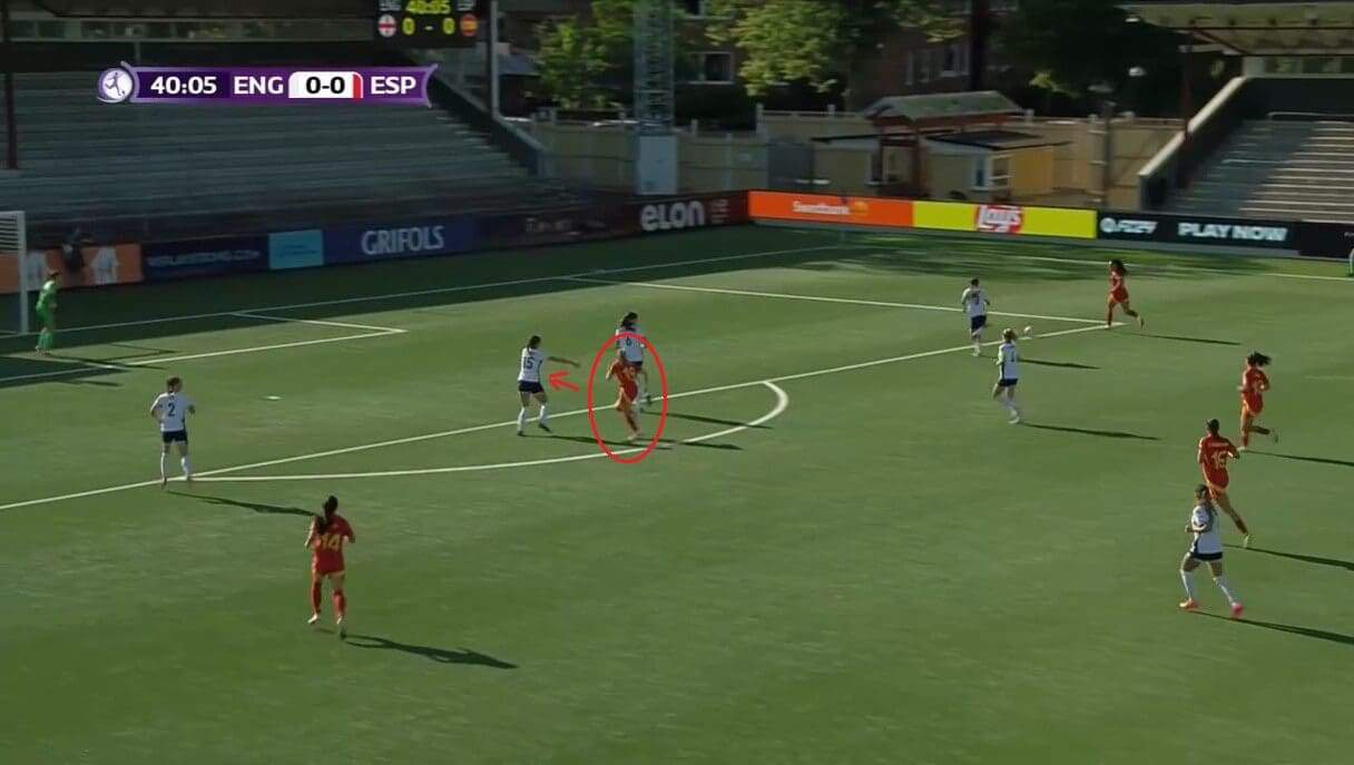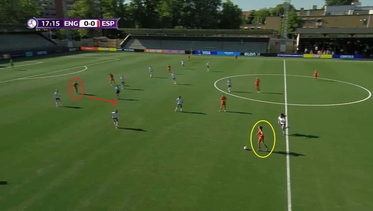 As a result of her perhaps not realising this in time, she ended up rushing her pass and sending it too far behind her, meaning that Spain lost their momentum and another Real Madrid player, Irune Dorado, was forced to track back a reasonable distance to regain the ball.