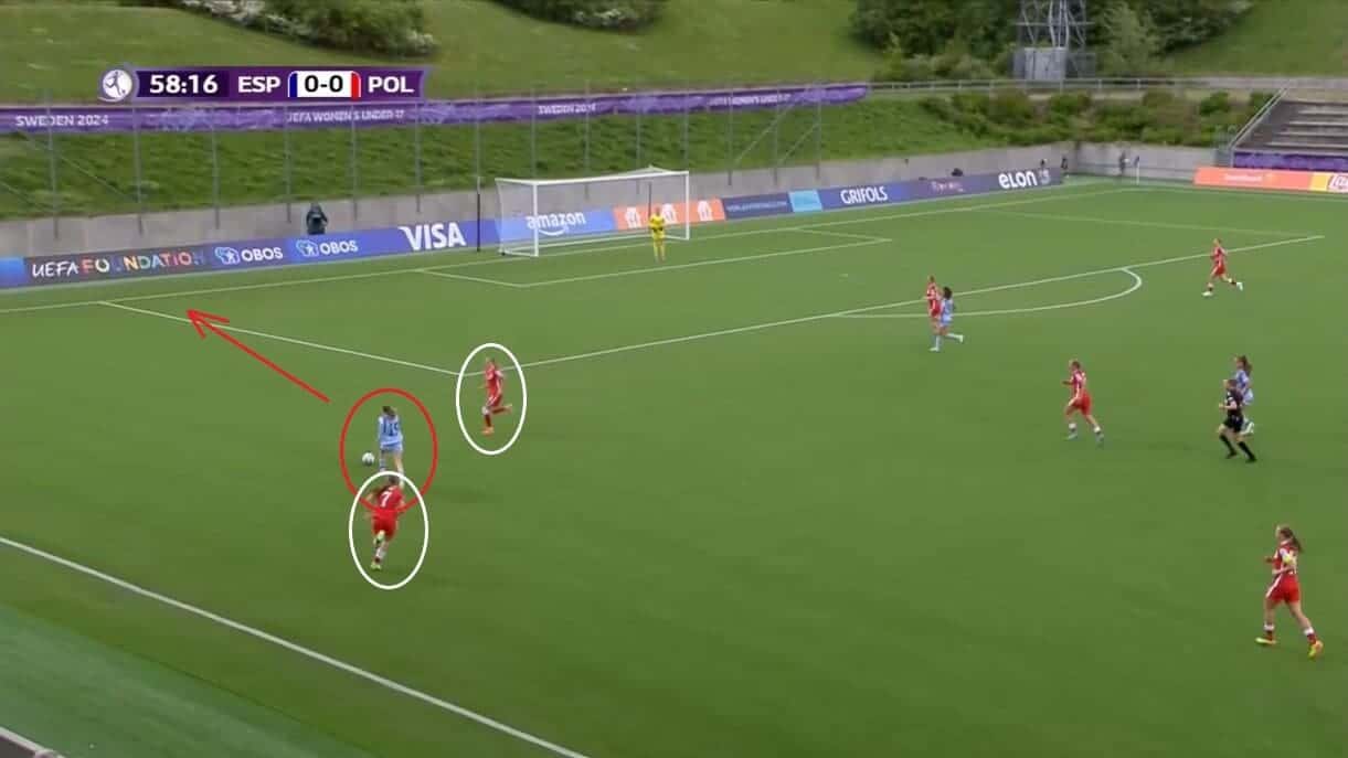 In this case, the Polish duo of Krystyna Flis and Iga Witkowska attempted to halt Cerrato’s run but were unable to do so. As a result, Poland conceded a shot on goal once the cross had found another Barcelona player, Ainoa Gómez.