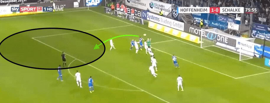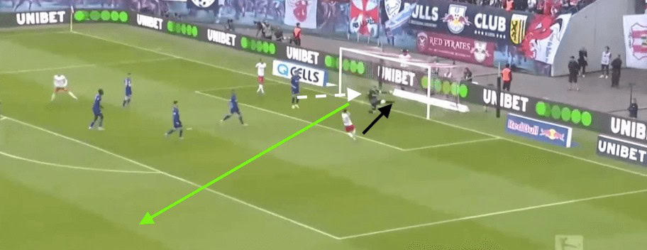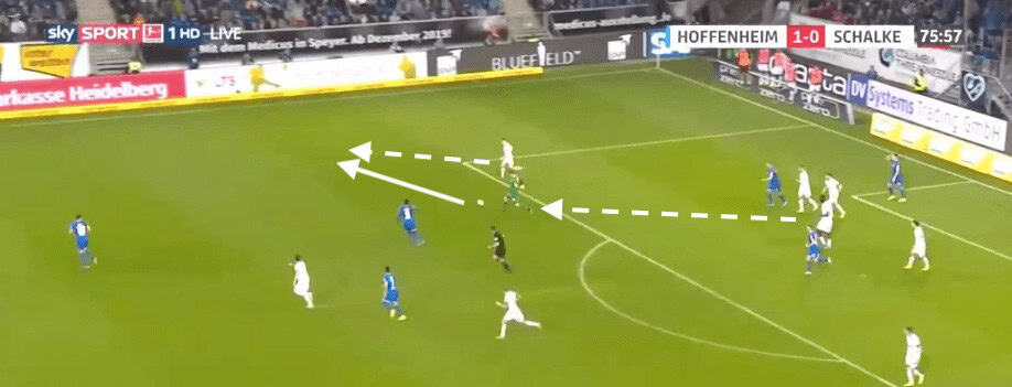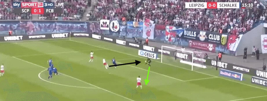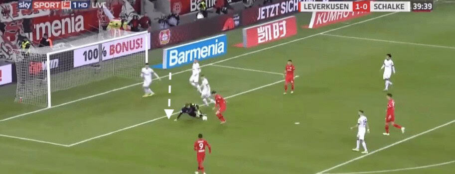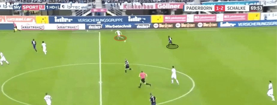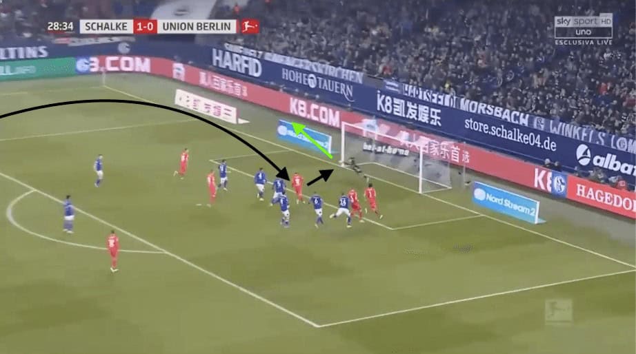 Here, Nübel notices that the opposition left-winger has pushed further infield than he should have. This leaves Schalke’s right-back in a lot of space. Nübel not only has the vision but has the passing technique to chip the ball 40 yards to his teammate. This gives the right-back space to run into as his marker is now behind him.