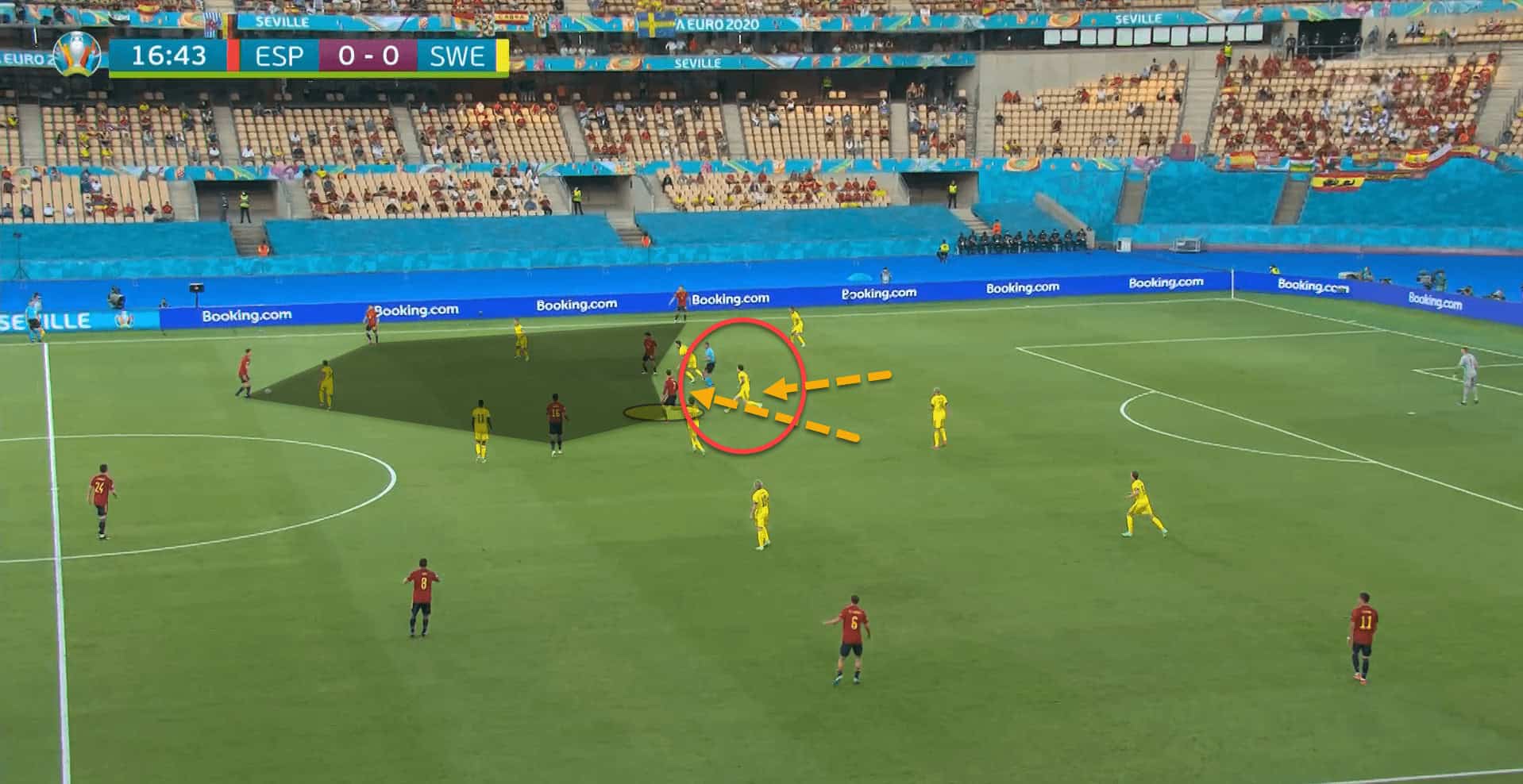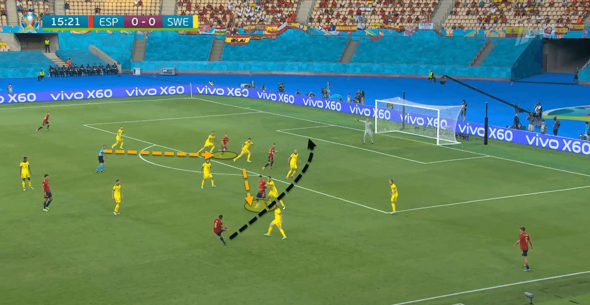 There was one situation against Sweden where this worked so well that Spain almost took the lead. Morata dropped short to allow Dani Olmo to push inside and occupy the two Swedish central defenders and to try his luck at goal. The RB Leipzig attacker forced a fine save from Robin Olsen as a result of this move.
