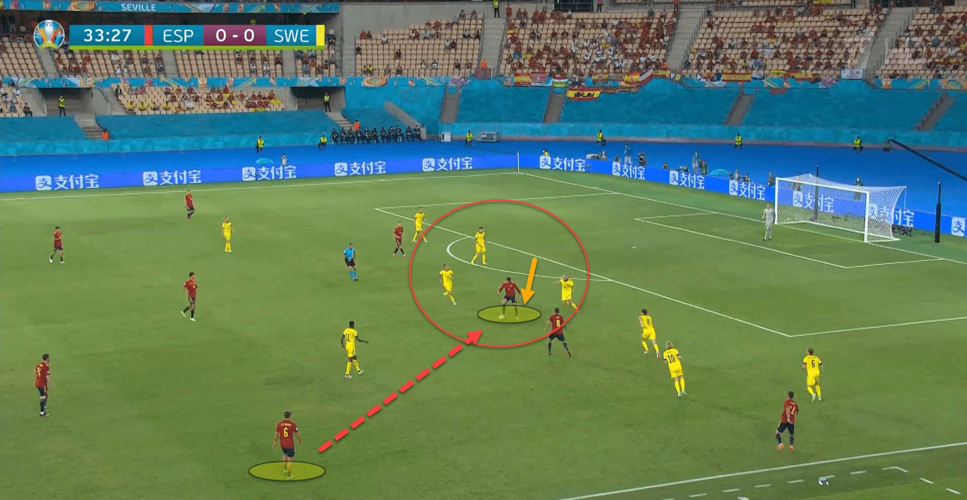 In this example, Marcos Llorente managed to find Morata between the lines with a pass that split Sweden’s first line of pressure as well as their second defensive line, progressing the team from the middle third into the final third with one pass.