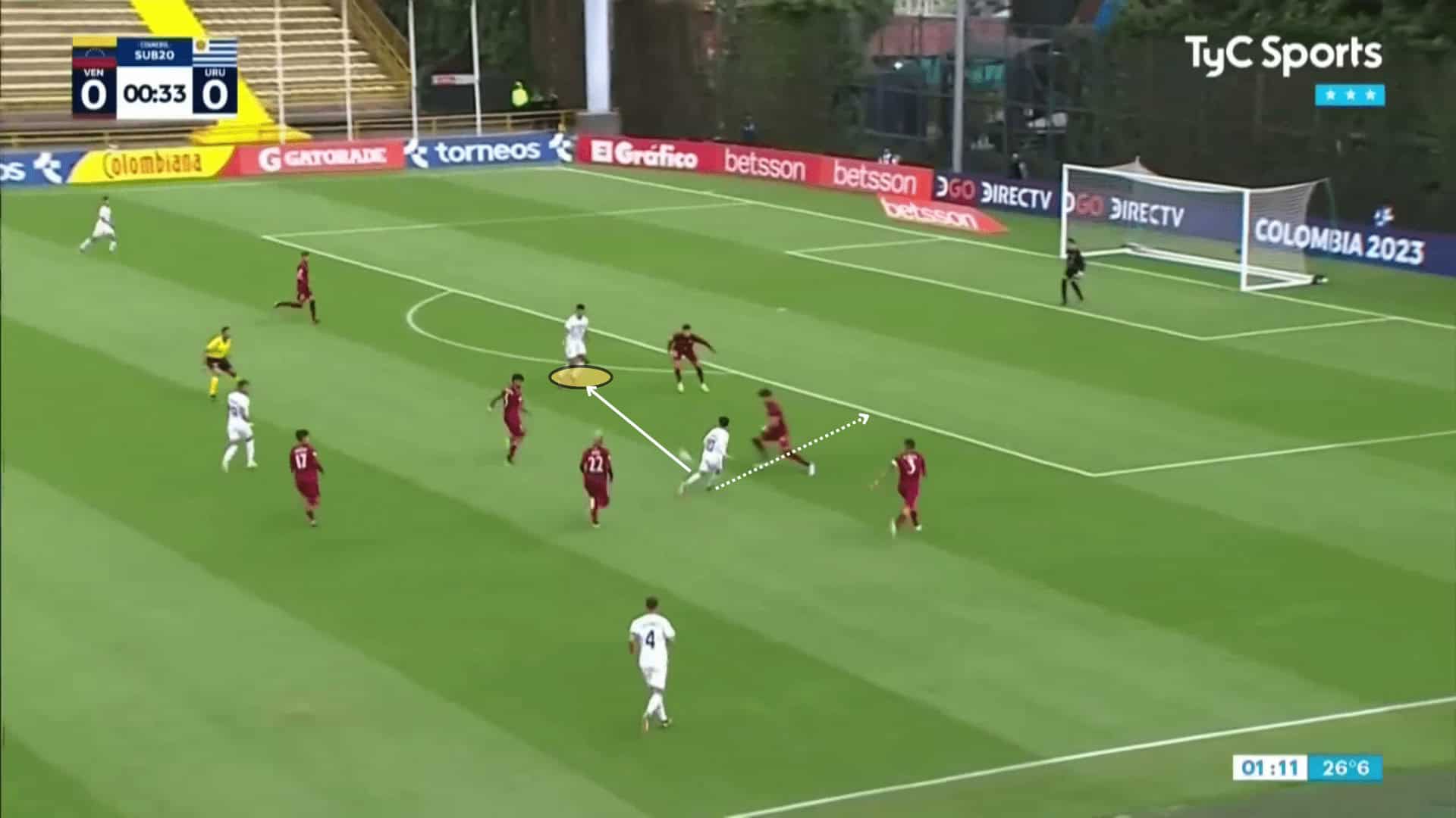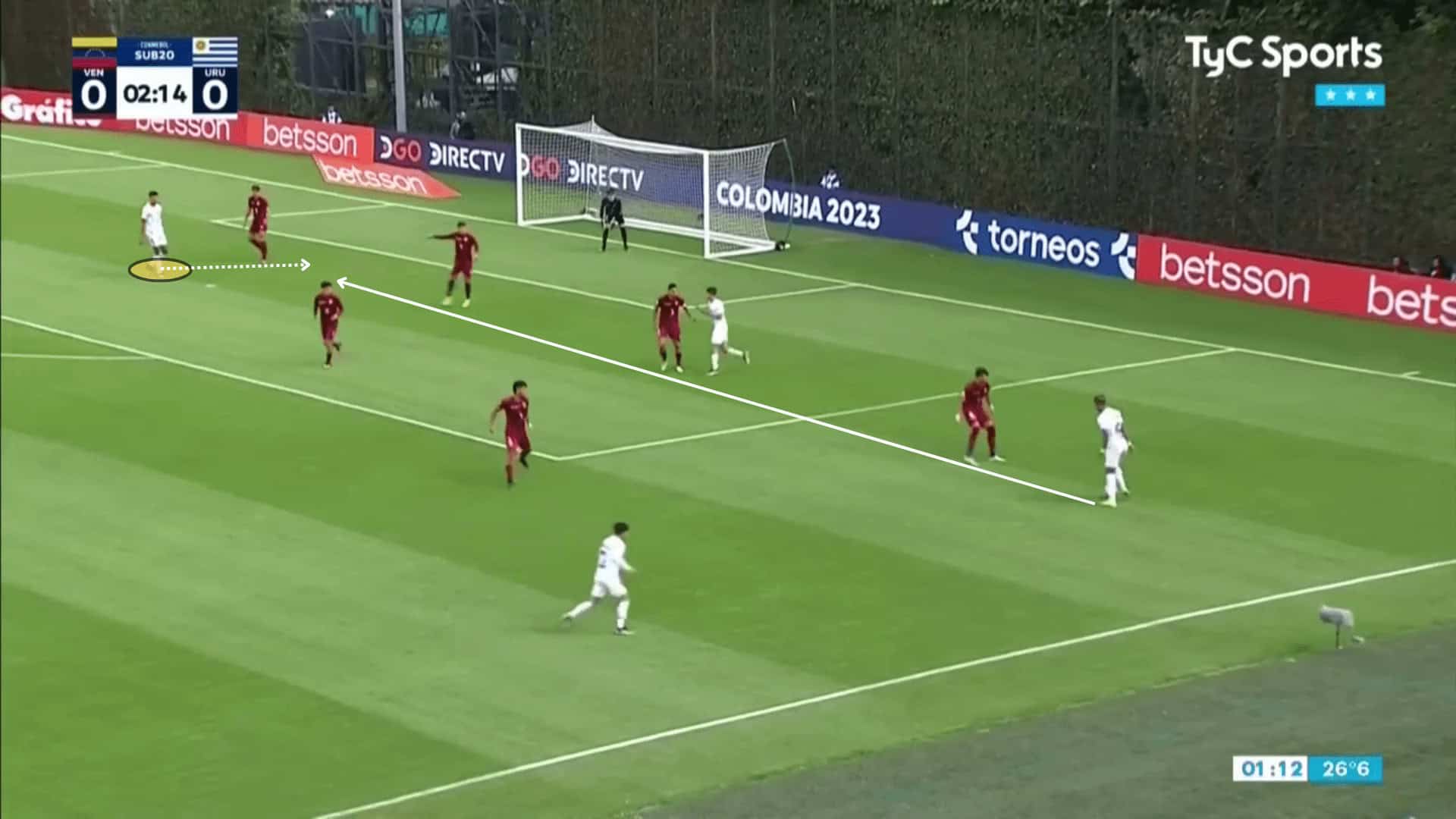 Rodríguez tends to stay up and right up against the centre-backs, stretching the play vertically. This puts him in a good position to challenge for aerial battles. This also allows him to be a direct out ball for his team during the build-up. His ability to win flick-ons and direct headers towards his teammates further up the pitch can often help his team bypass the opposition’s press.