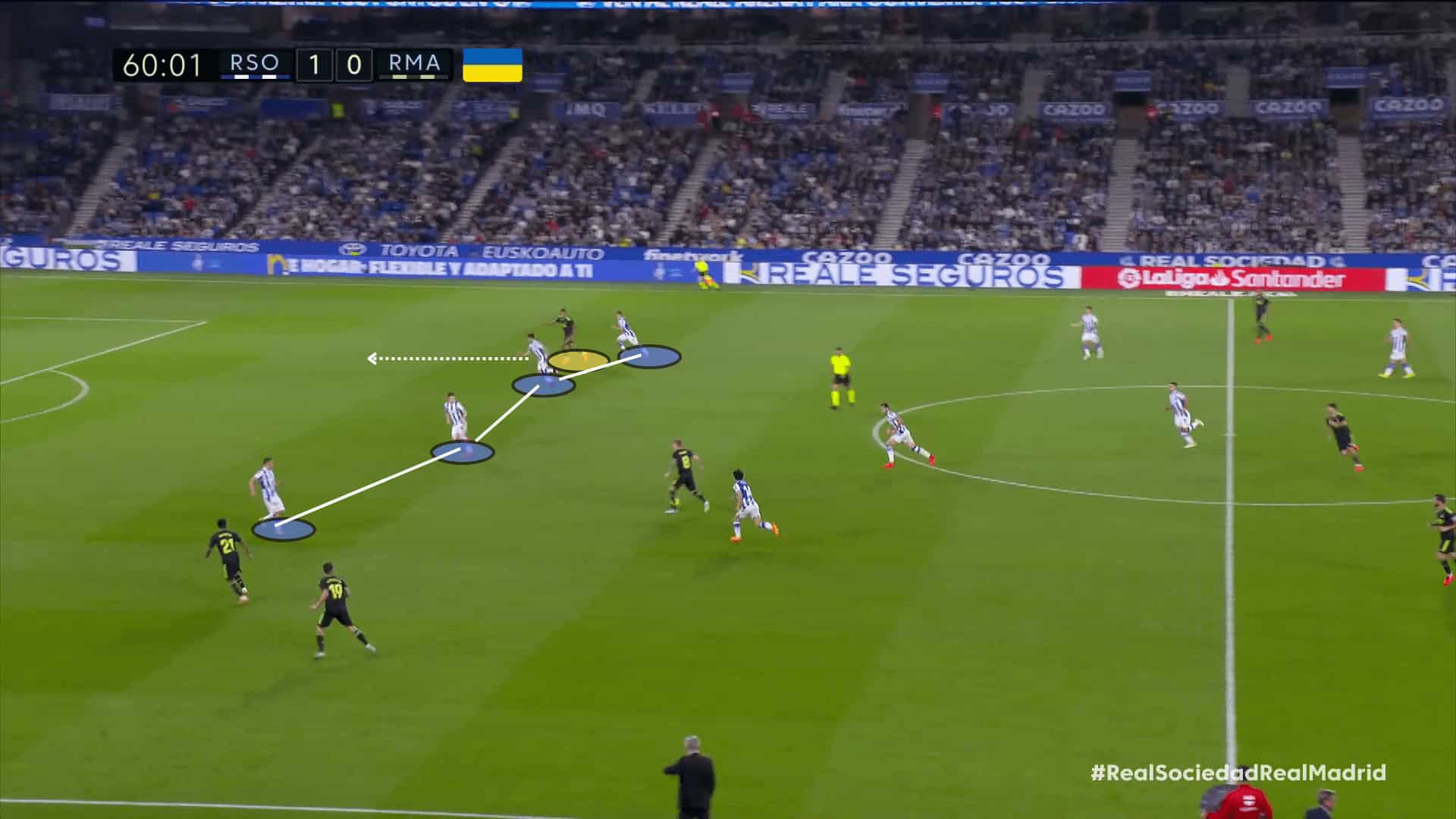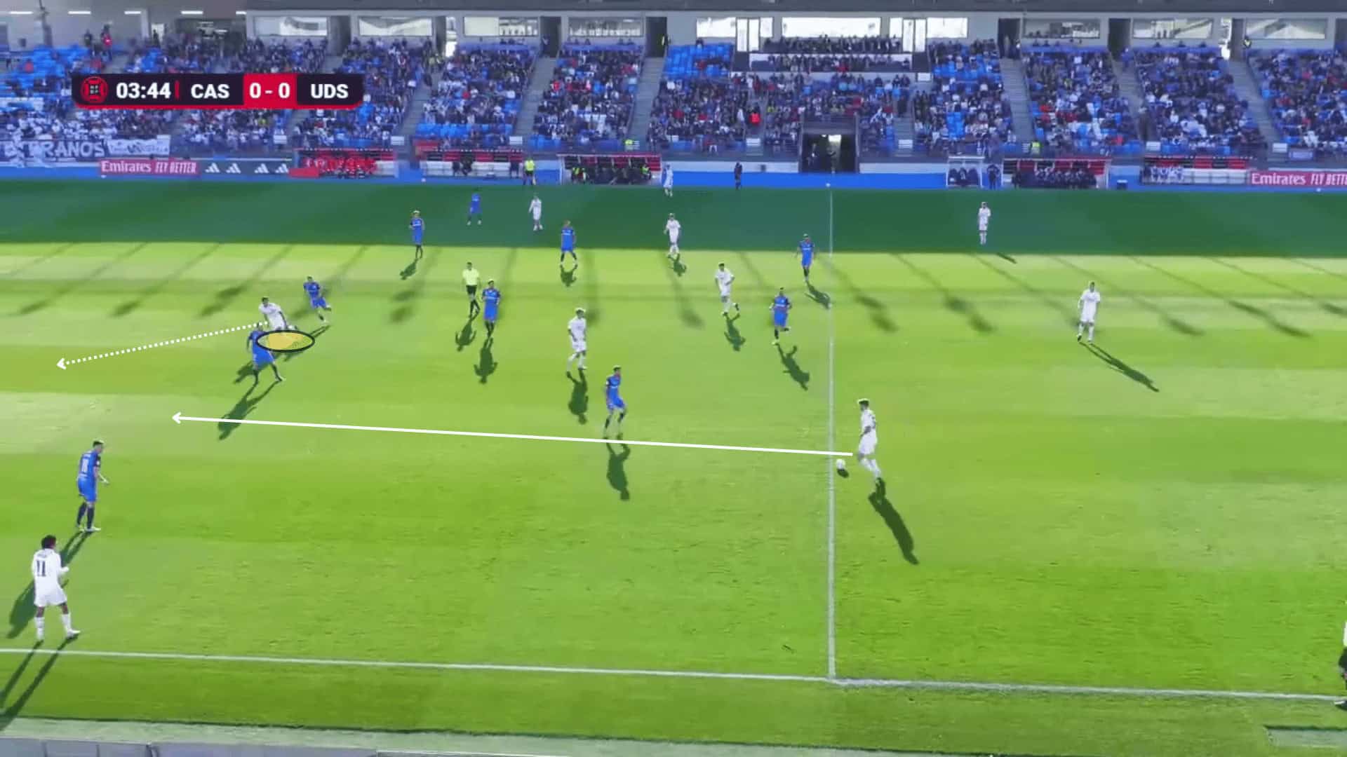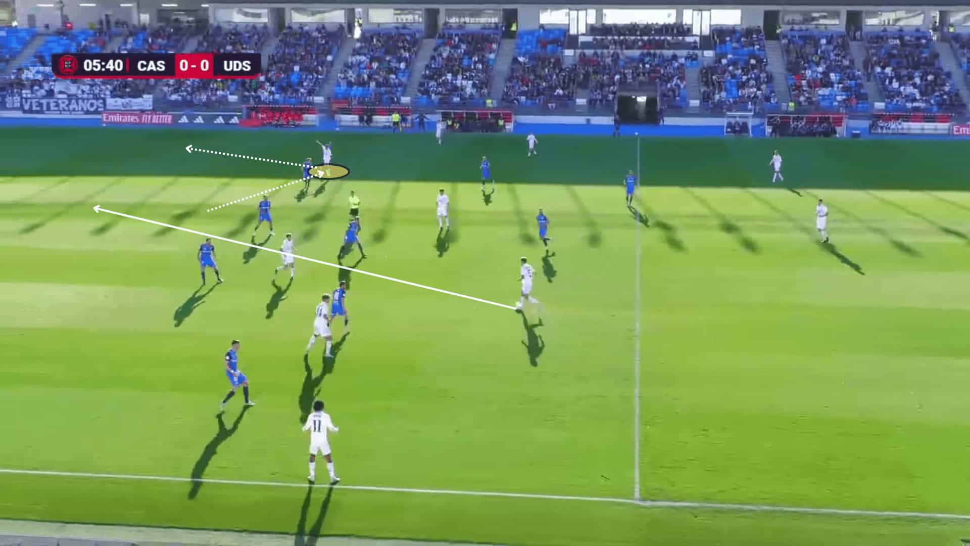 This is even more evident in the 3-5-2 system that he plays in under Raúl in Real Madrid Castilla. His striking partner is often the one to pick up spaces between the lines, or drop into midfield during possession, leaving Rodríguez the furthest forward, running in behind and away from the man with the ball. By making runs behind the field of view of opposition centre-backs, he often finds himself with time and space when he does receive the ball, allowing his tidy finishing to put the ball into the back of the net.