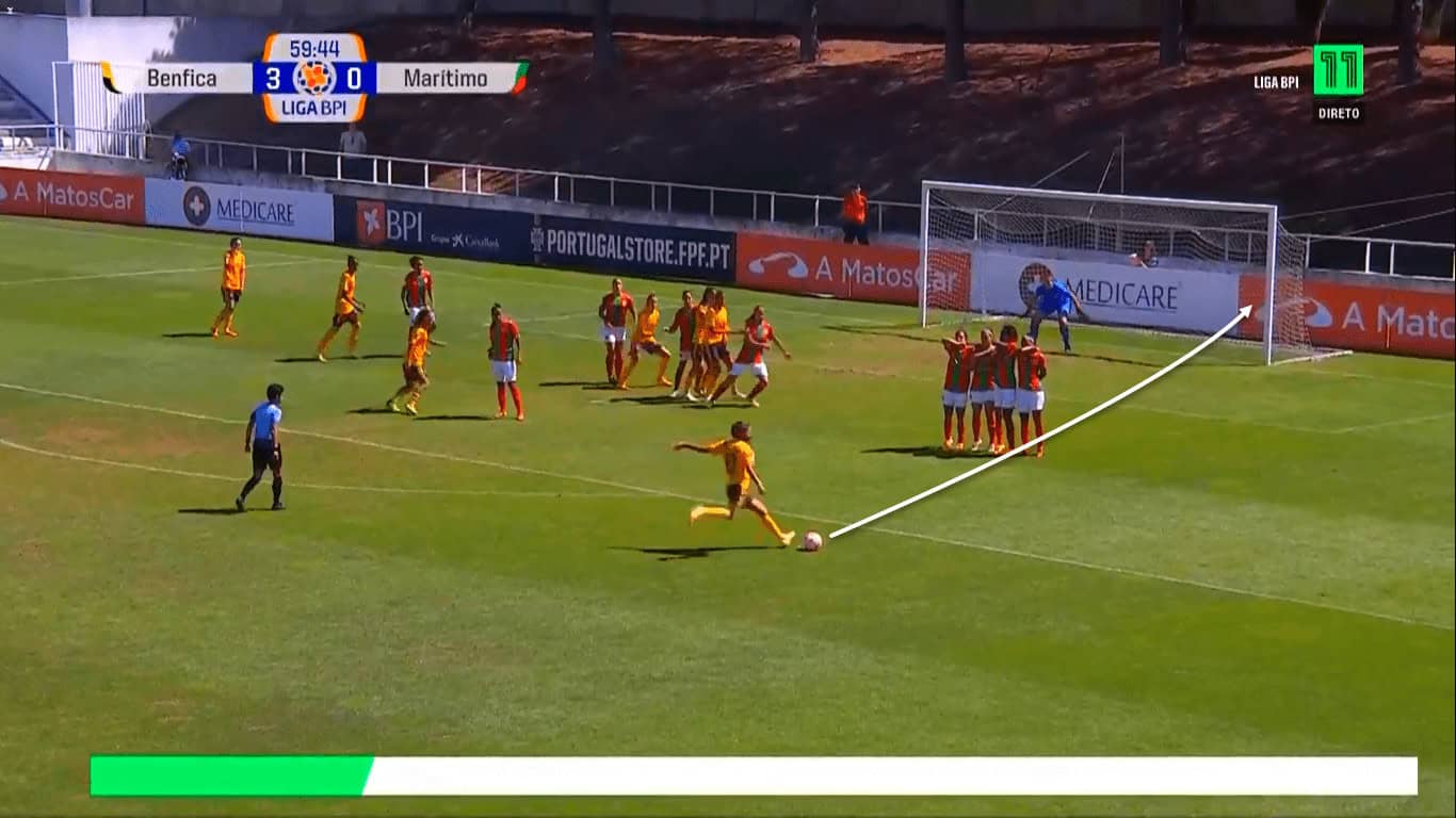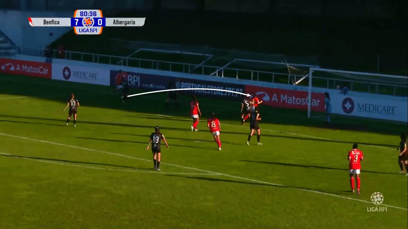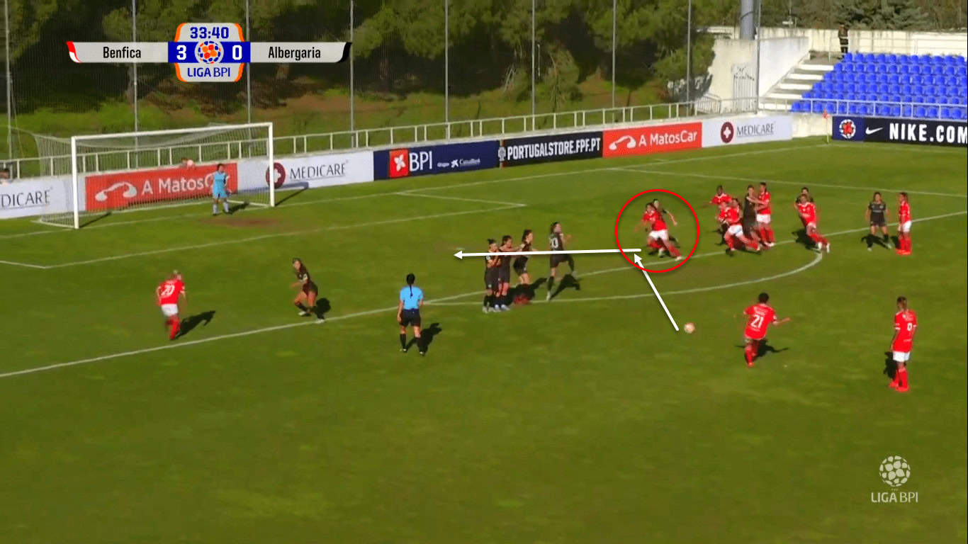 Besides being a very impactful player from open play, Vitória is also a very reliable player during set-pieces, either when she takes or waits for the delivery. She often creates danger when she waits for deliveries as she usually knows how to avoid marking and ask for the ball as she did during the following set-piece. In fact, Vitória was able to score a goal after receiving a through pass in the free space thanks to her movement without the ball to escape from her direct marker before shooting on goal with success.