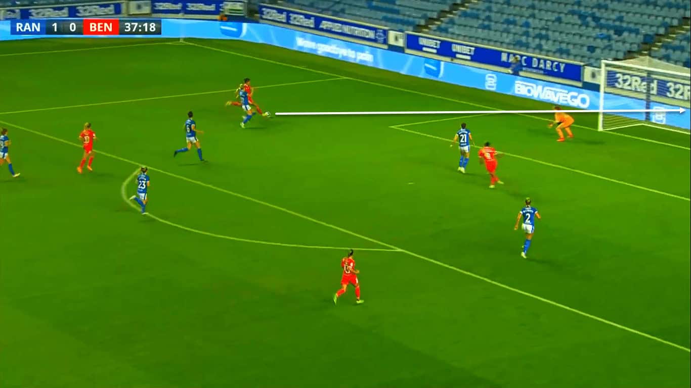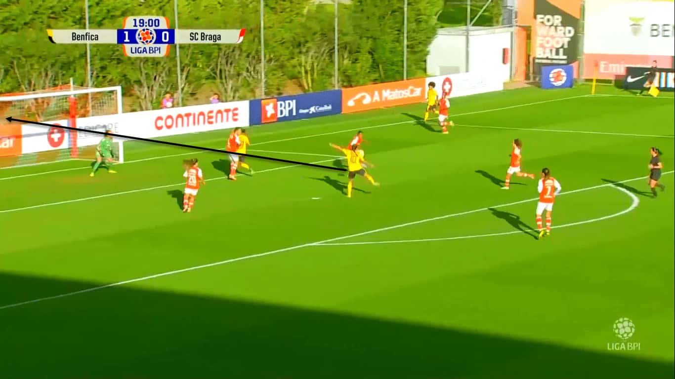 As an example of Vitória’s notable roles at Benfica, we can notice in the following example that she shoots with her left foot in this action to score a goal from a difficult angle after advancing from the left wing. This highlights that shooting with the left foot doesn’t really represent an issue for Vitória and that the Brazilian can play both in the right and left winger positions with almost the same efficiency while providing threat in both cases.
