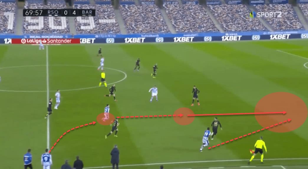 Even though Real Sociedad are a positional team that wants to have the ball, it seems like Barrenetxea is utilised chiefly as a valve for side switches or is deploying those passes himself when used in that wingback/full-back role.