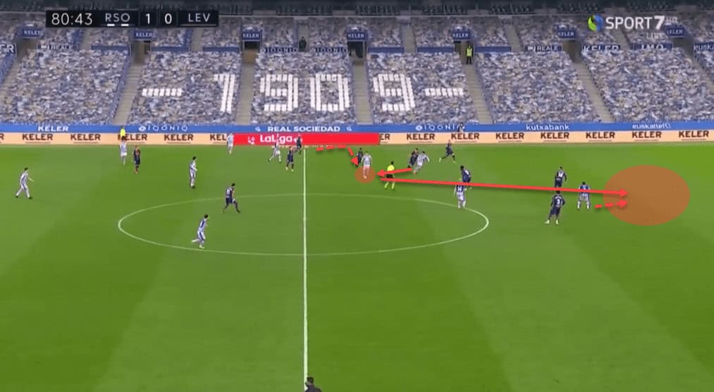 Here’s another example of a great run and link-up with his teammate followed up with a key pass that sets up a great goal-scoring opportunity for Real Sociedad against Levante.