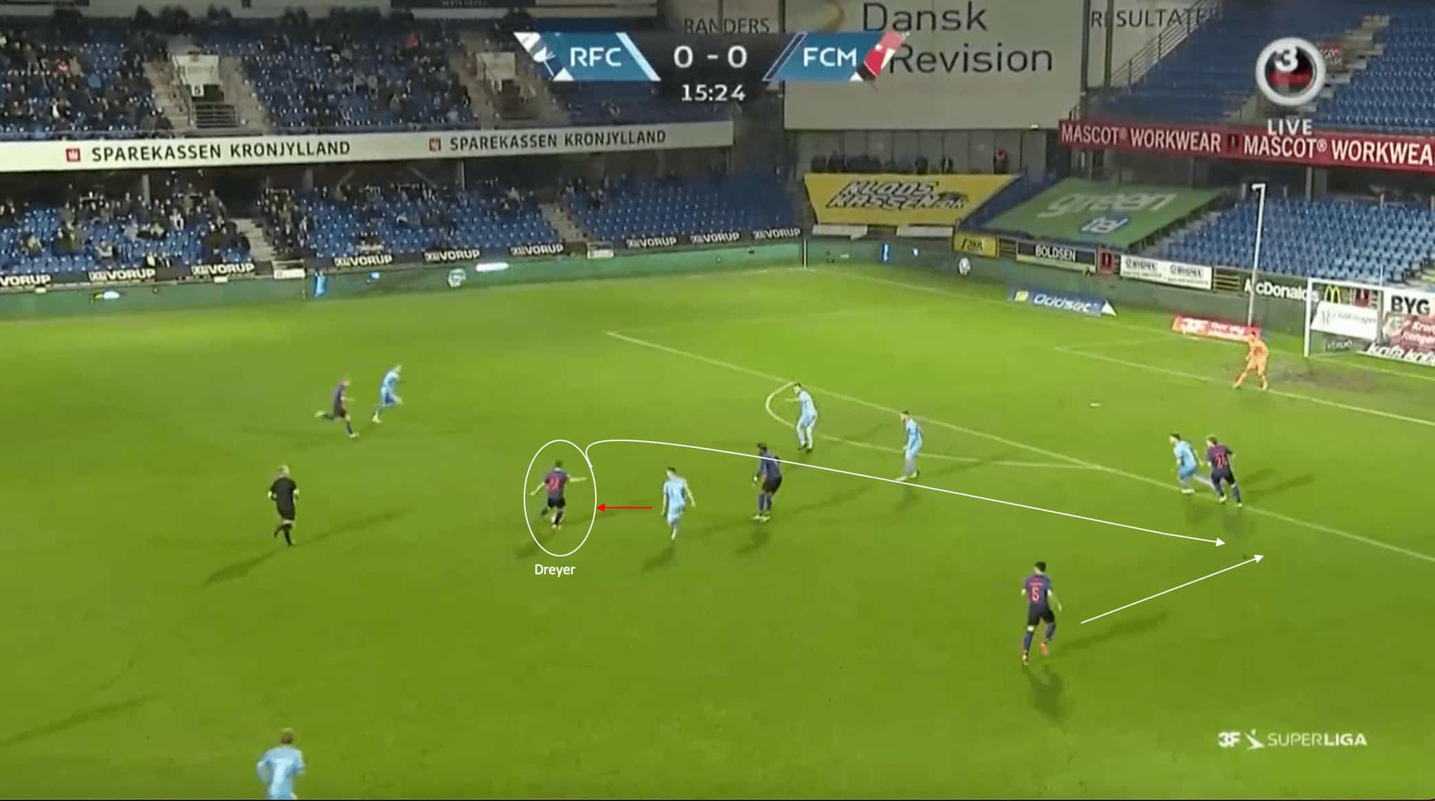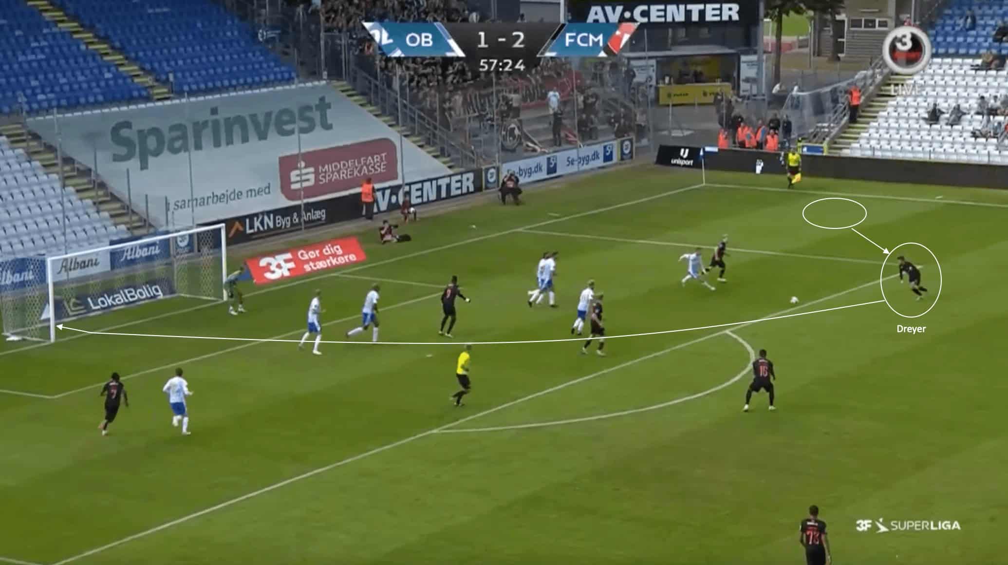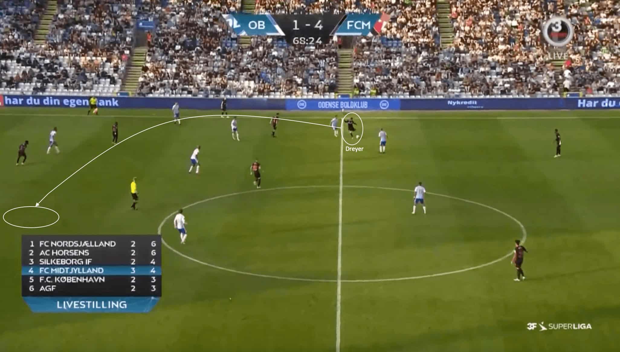 Dreyer was able to spot the far-side wide player in plenty of space, and even with him being closed down by the opposition player, was able to spray a perfectly weighted cross-field pass into the path of the attacker. In the image, the player is not in view, but the pass was received and eventually led to a goal for Midtjylland, one that would likely have not occurred if not for the vision and range of passing of Anders Dreyer.