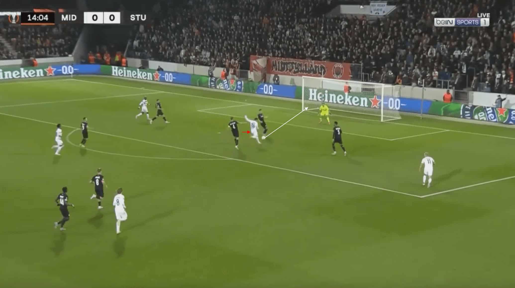 The image above shows Dreyer operating in a central position and being able to get a quality shot off under pressure from the opposition defenders. In the phase of play above, Midtjylland are engaged in a quick counterattacking sequence of play, with Dreyer having to occupy the central striker position. The ball was played centrally to Dreyer from the wide player, with Dreyer taking a relatively poor touch which allowed the Sturm Graz defenders the chance to close him down and block the shot.
