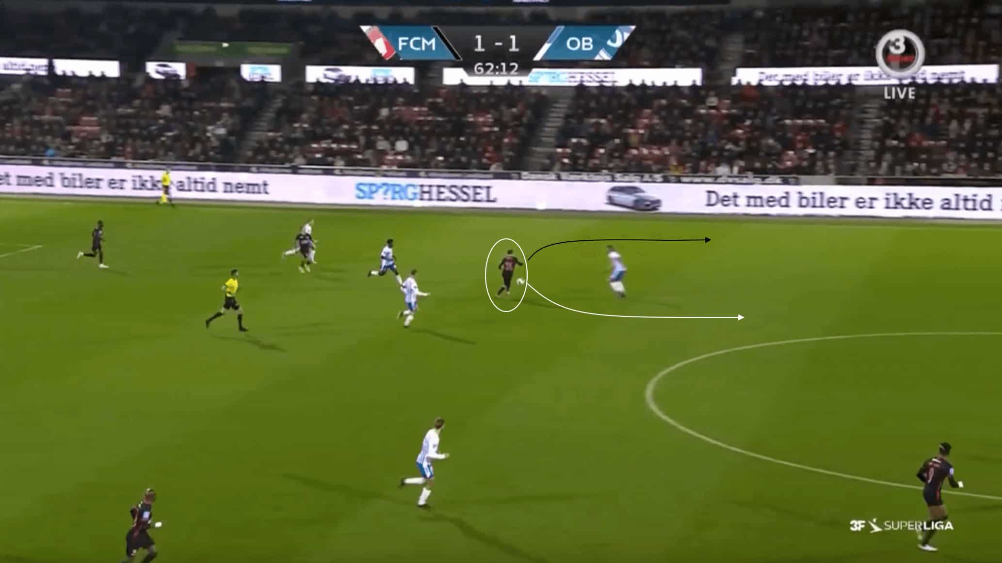 This pass caught the opposition defence off guard, with all the defenders looking towards, and anticipating, the pass to go to the opposite side. As a result of Dreyer scanning his passing options before receiving possession, he was able to play the most dangerous option, resulting in Midtjylland being able to progress the ball into the opposition’s penalty box.