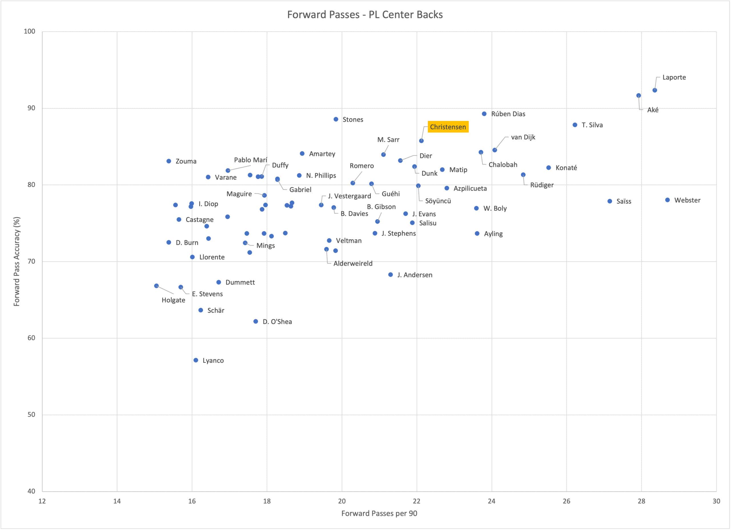As such, the following data displays Christensen’s passing metrics in comparison to other Premier League centre-backs this season, starting with forward passes.