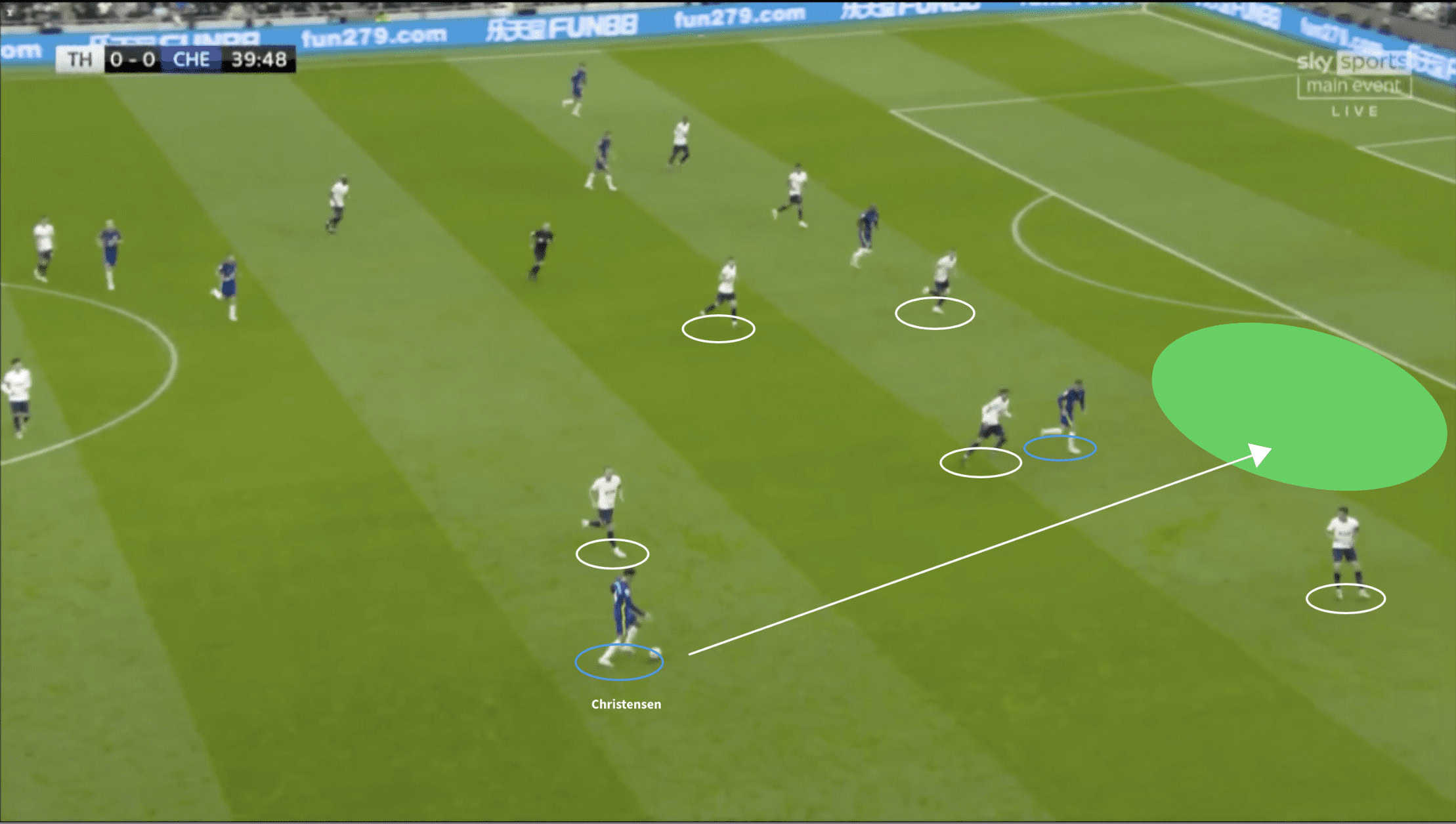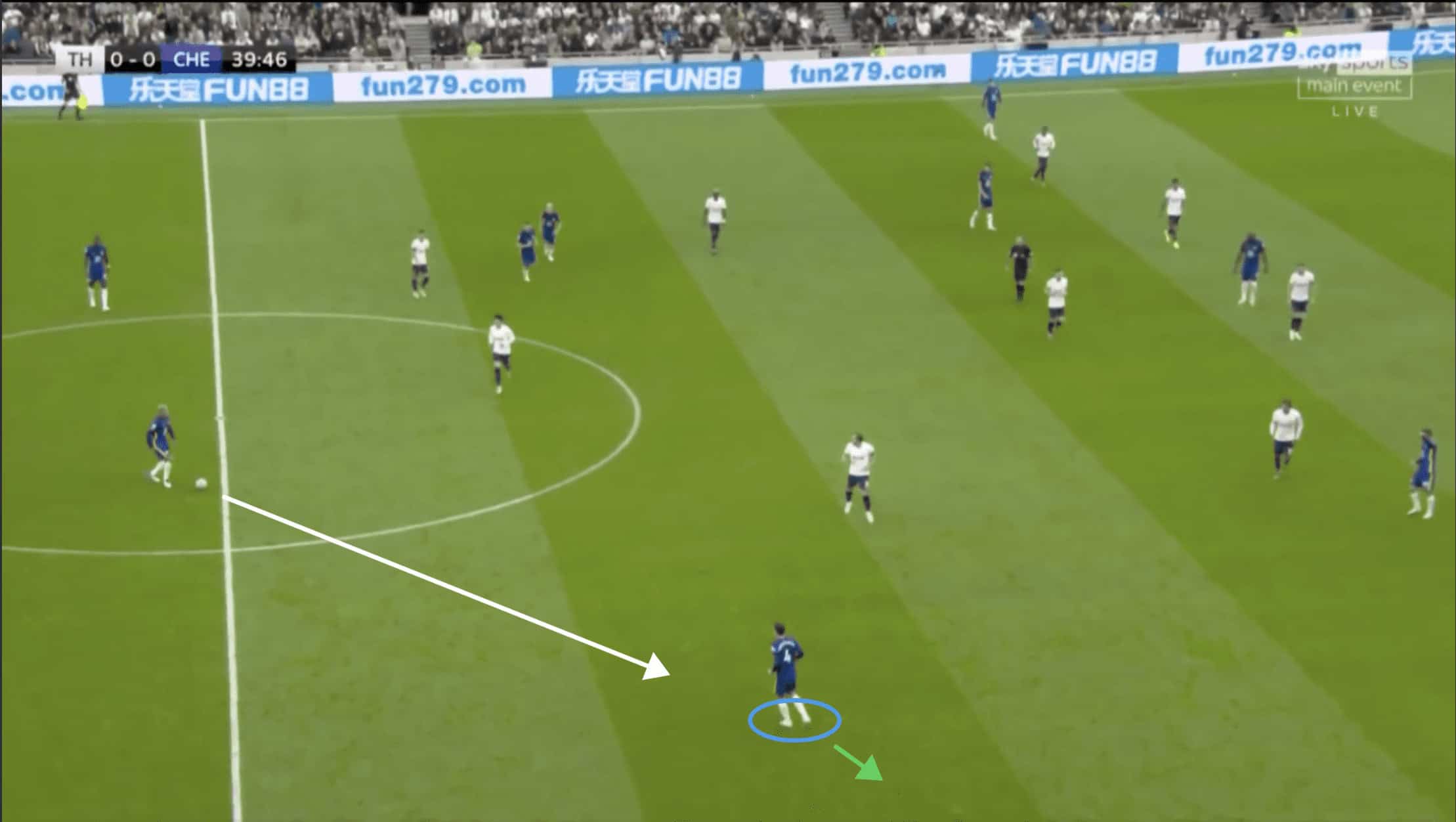 Christensen drives forward into this space, attracting engagement from the Tottenham backline, some of whom have drifted out of position to restrict the amount of space in front of him. This generates space behind the defence that Christensen, again ignoring a simple passing option to the RWB (out of frame), exploits by completing a through-ball into the penalty area.