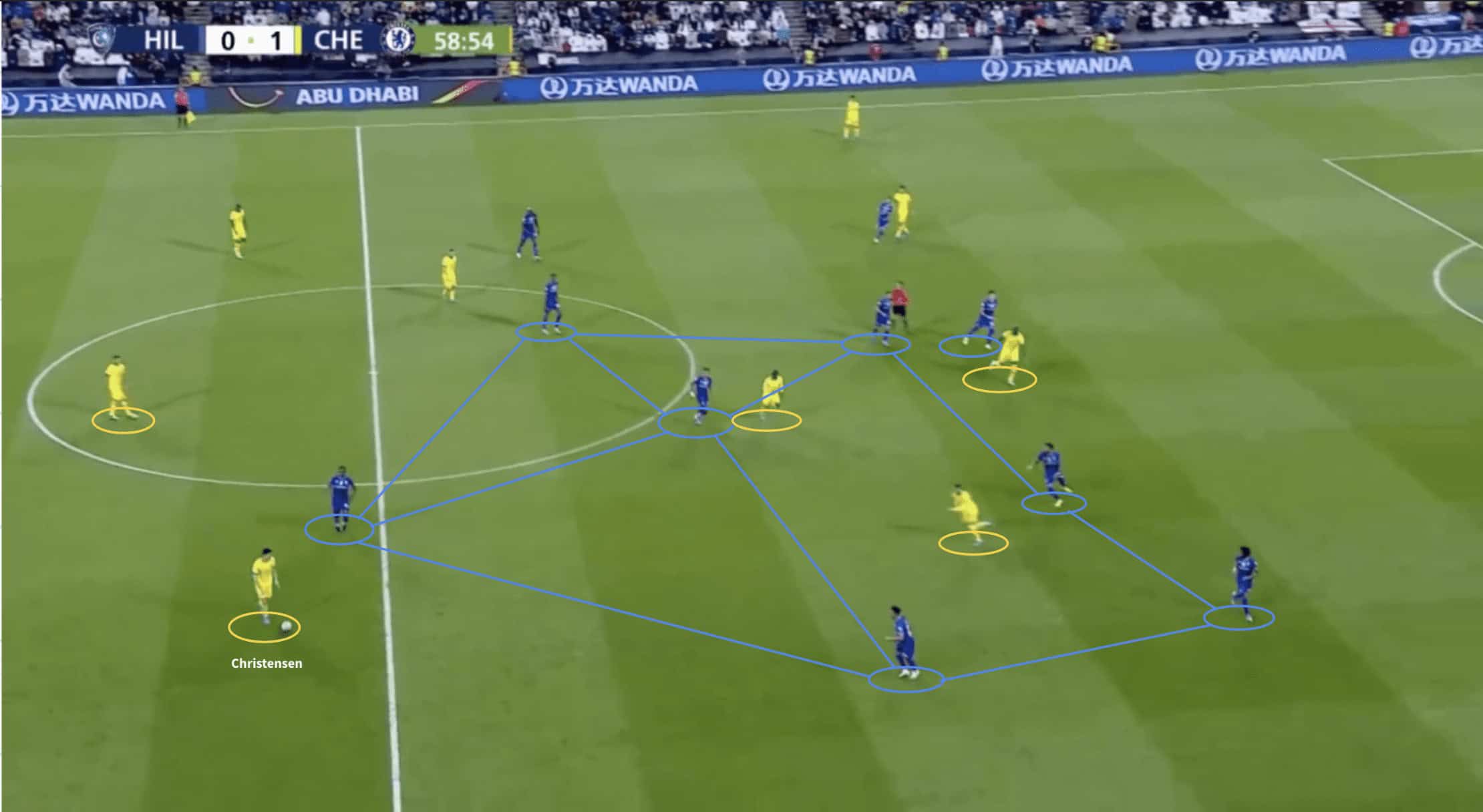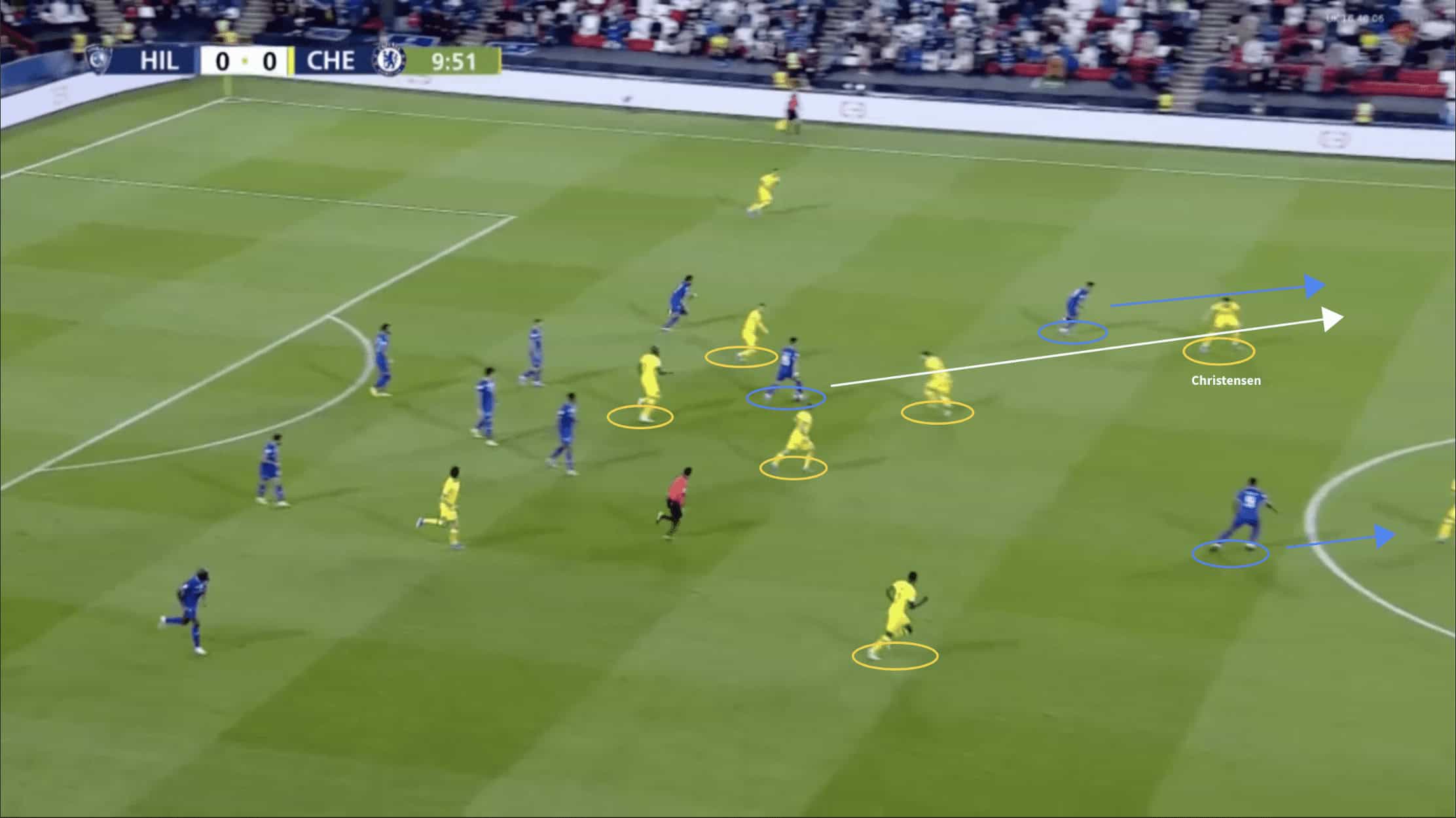 Christensen uses his technical elegance to evade the challenge of Al Sahrani, preventing any chance of an effective opposition counter-press. His ability to transcend this pressure additionally opens a progressive passing option to Azpilicueta, driving Chelsea into a dangerous area of the pitch.