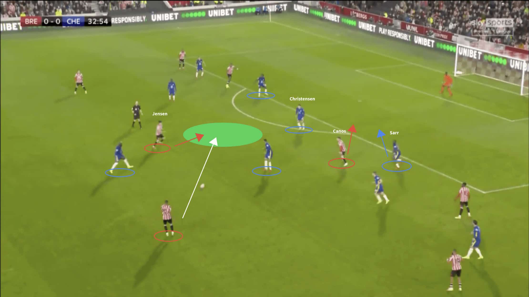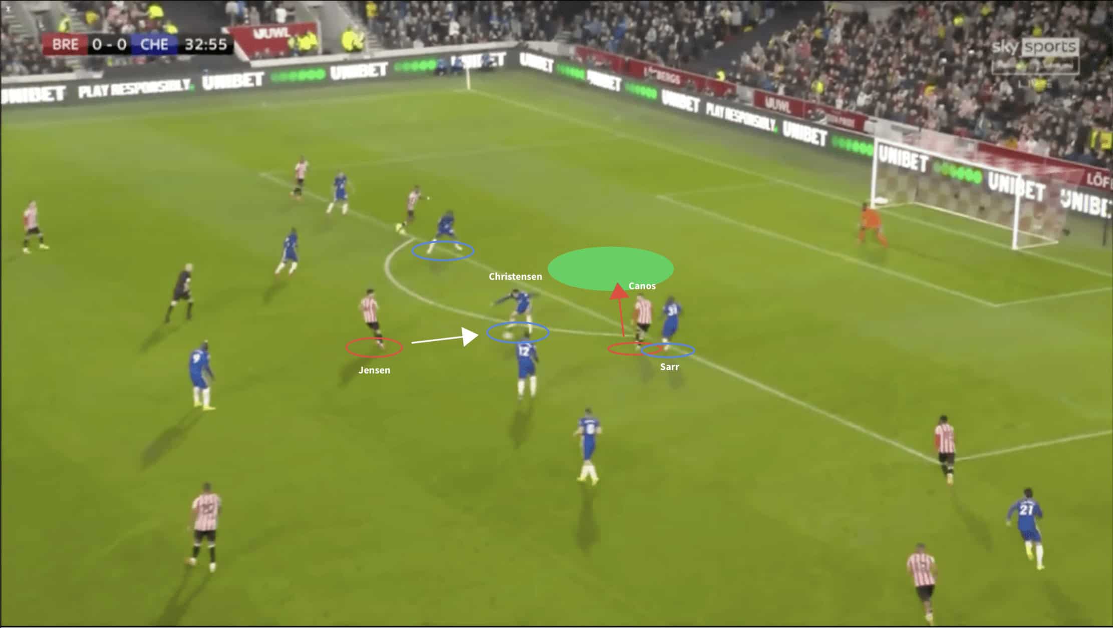 Here, Chelsea’s opponents Brentford are easily able to transcend an uncompact midfield block and progress the ball into the assist zone. Christensen, assuming the central role in a back three, now faces a dilemma; either engage with Jensen and leave Canos to make a potentially hazardous blind-side run into the unmarked space, or follow the run and allow Jensen control of a potent position on the pitch.