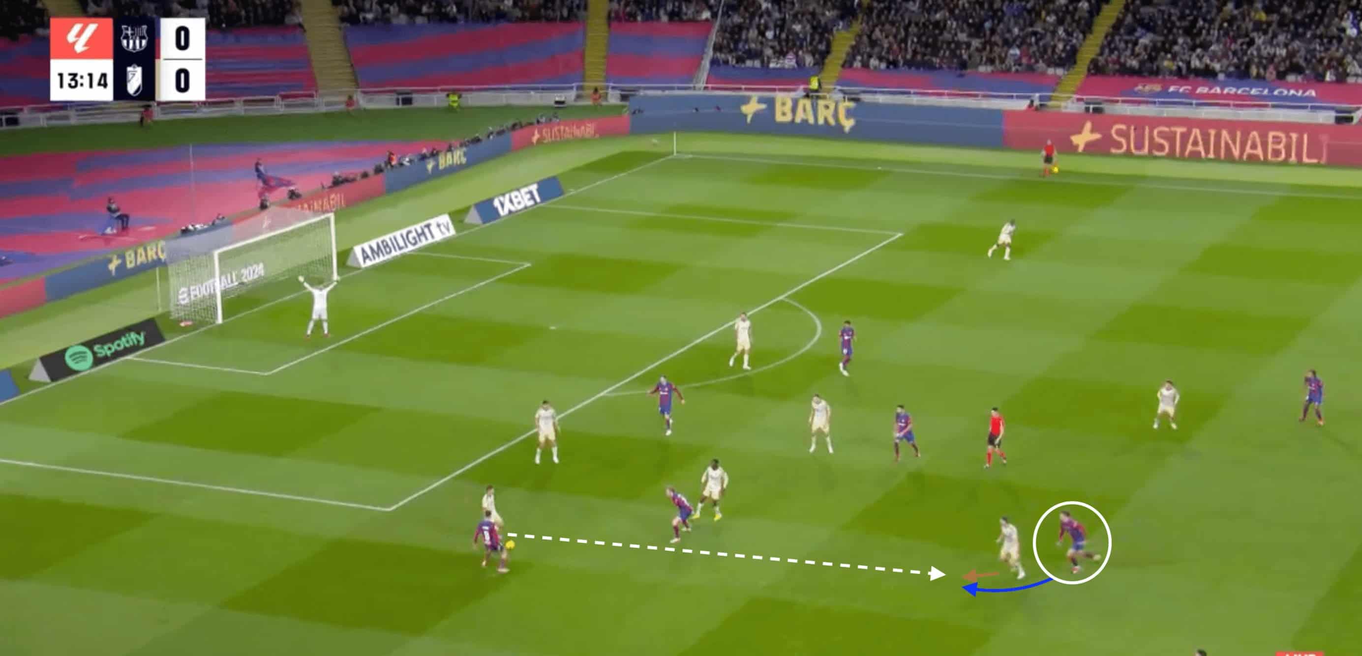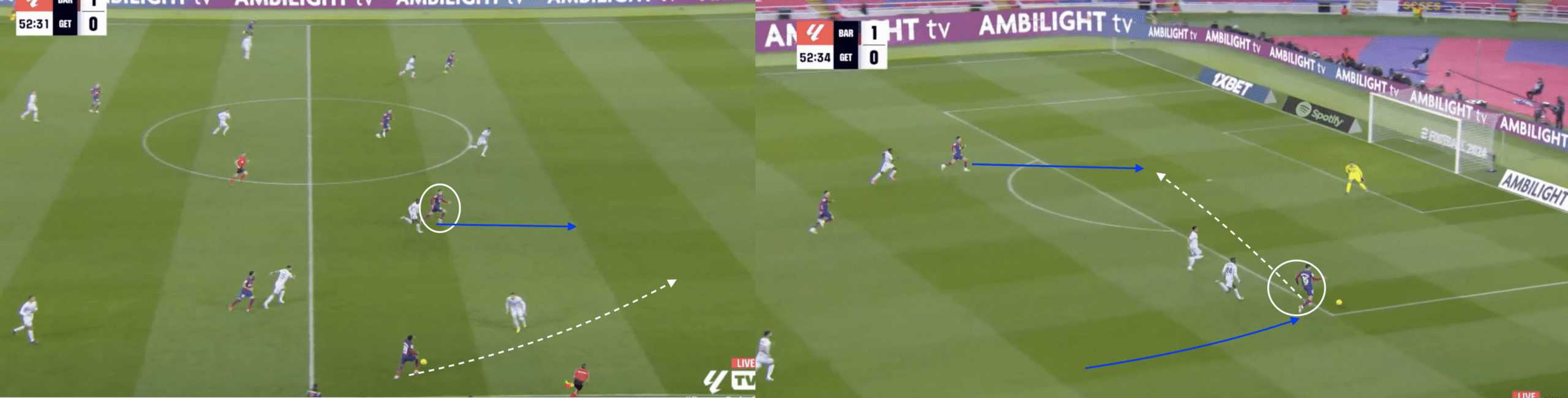 Christensen’s carrying has also been particularly impressive, either within his half evading pressure or even driving into space in front of him and continuing his side’s attack. This was certainly evident against Getafe, where a surging run from the Dane allowed him to receive a pinpoint through pass from Raphinha before sliding it across the box for Felix to convert.