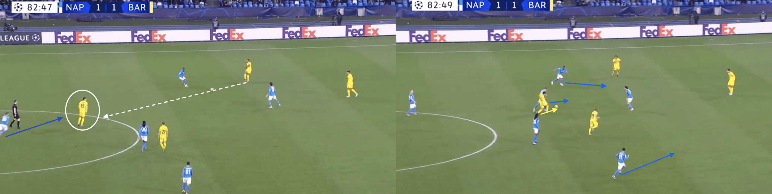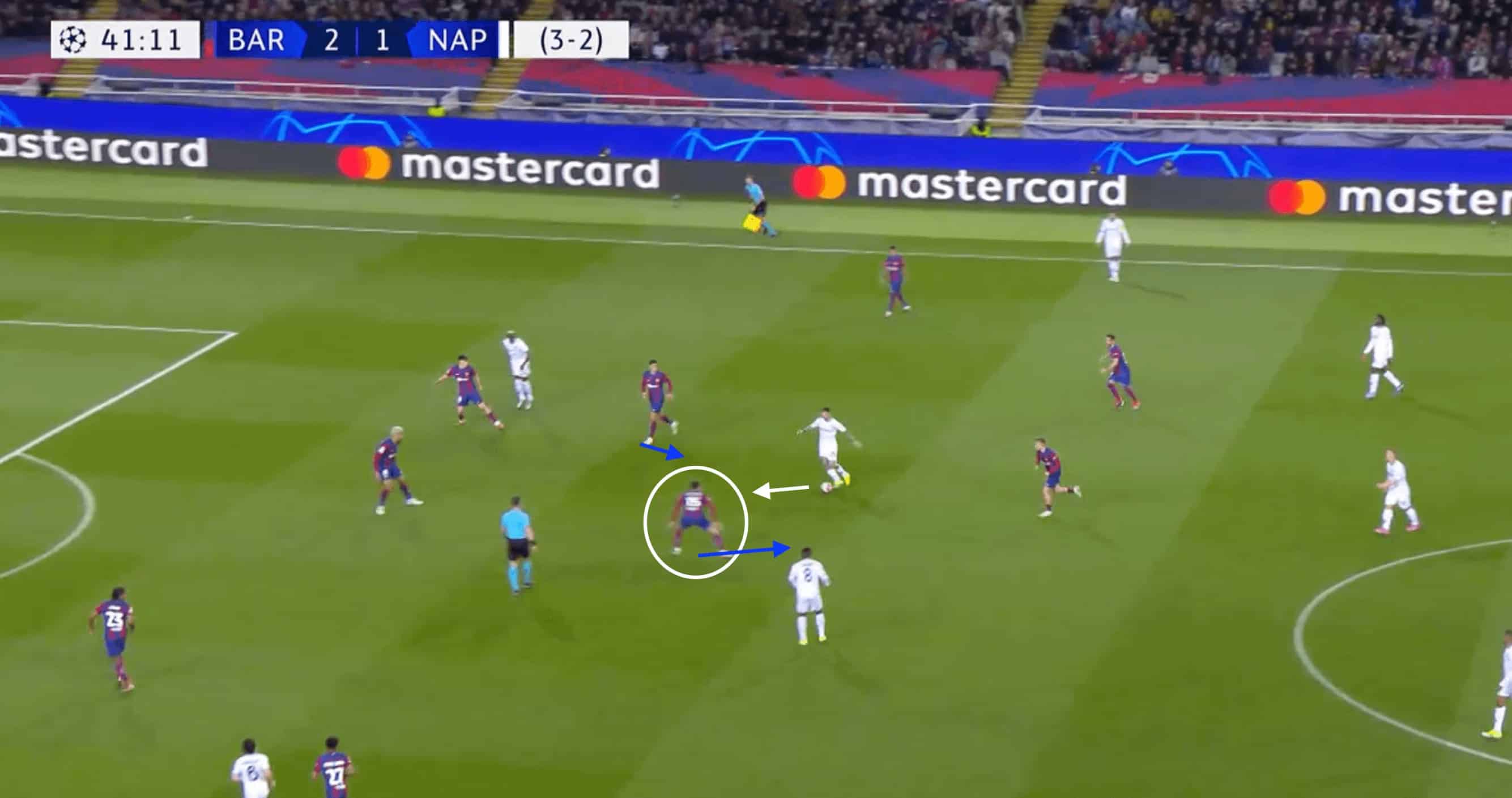When sitting at the base of the midfield, the Dane acts as the initial barrier of defence, with his physical presence forcing the opposition into hasty decisions in the final third. In their Champions League encounter against Napoli, we can see Christensen use his body shape and defensive positioning to block passing outlets and force Di Lorenzo into the central areas. Because Barcelona were set up well with numerical superiority, Cancelo was able to regain possession with ease, and Barcelona could recycle the ball.
