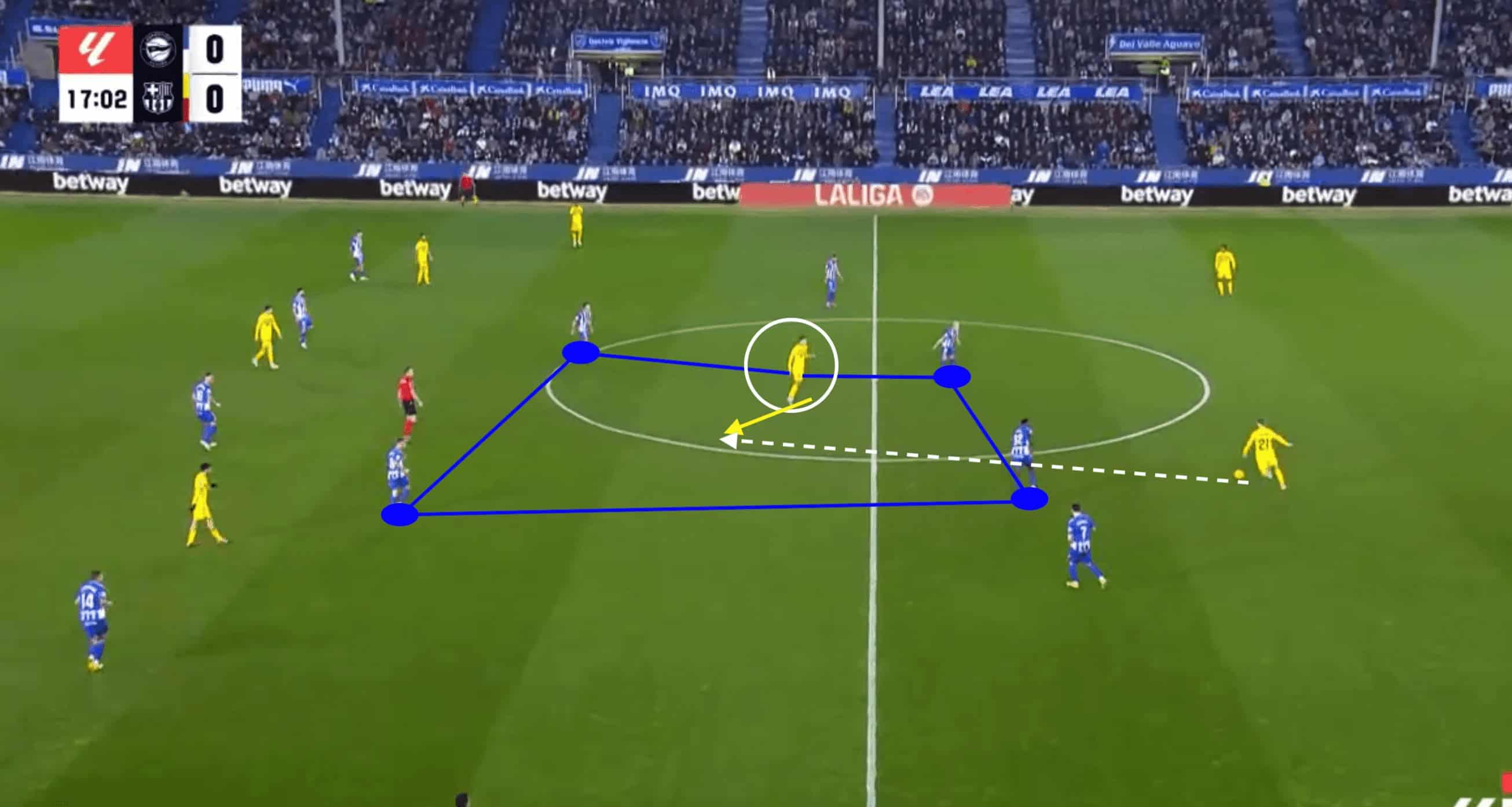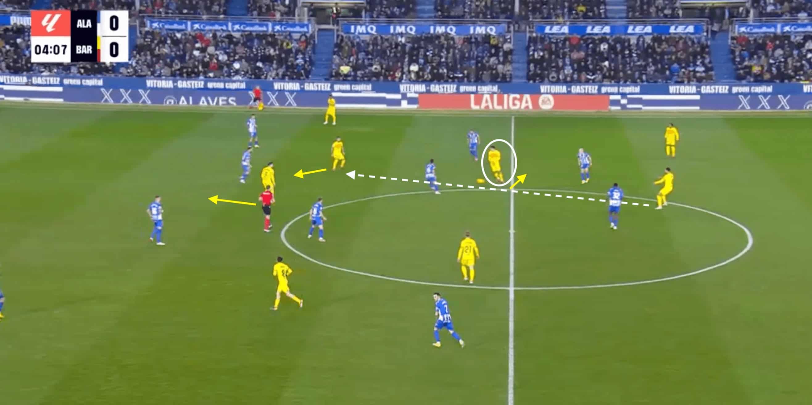 Having formed an intelligent relationship with his partner in the pivot, he recognises opportunities to advance should they drop deeper to receive the ball from the goalkeeper. Christensen’s off-the-ball movements have also had a positive indirect effect upon Barcelona’s build-up. Against Alaves, we can see Christensen’s presence drawing defensive attention and creating space for Araujo to hit a direct ball straight into the feet of Gündogan, with the German receiving between the lines and looking to launch an attack.