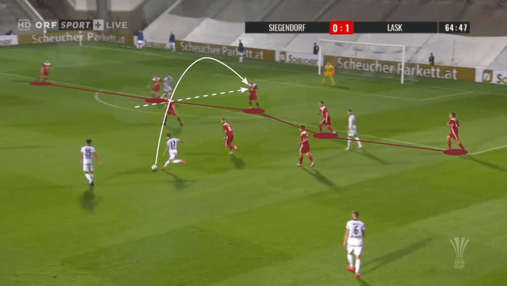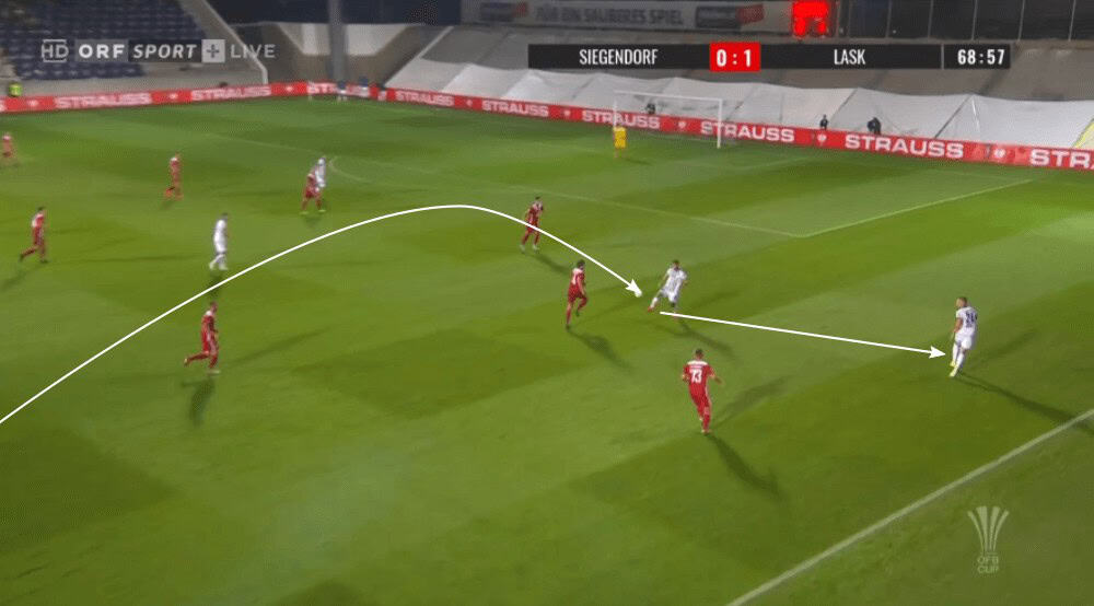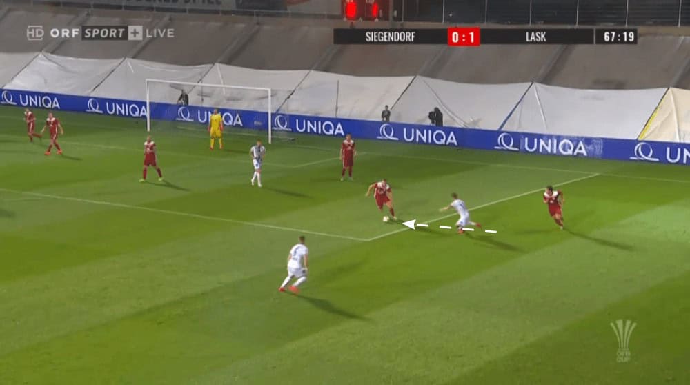 Besides the question how well and quickly Gruber will adjust to his new role, the second concern is how he will perform in a stronger team since at Mattersburg he was among the very best players of the club which is not the case at LASK Linz. In the first competitive game for his new club in the ÖFB Cup against Siegendorf from the fourth Austrian division he got subbed on, scored instantly a goal and showed overall a decent performance. In this part of the tactical analysis, we will focus on his role in this match paired with my knowledge about the style of play of LASK Linz.