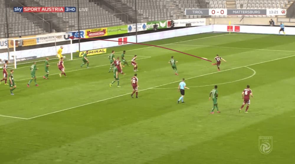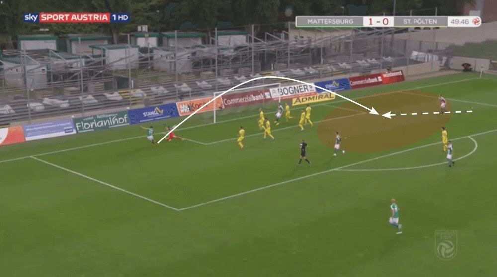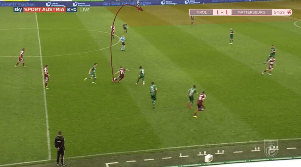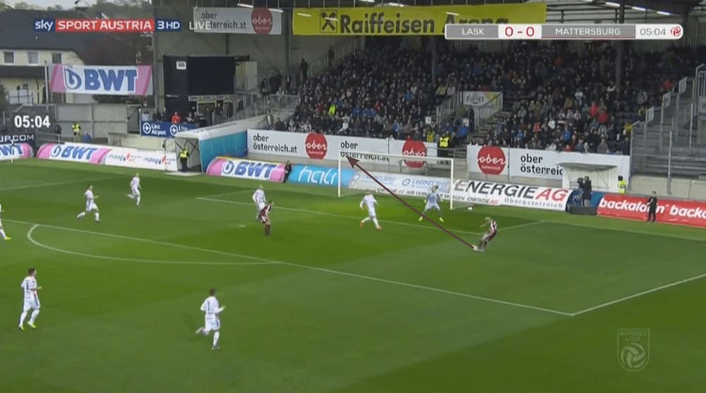 Gruber tried exactly that from a more central position in the ÖFB Cup fixture as we can see in the example below. Even though it is not a typical cross, it is also a situation in which he exploits his vision and technical abilities to play a good ball towards Raguž who is unfortunately unable to score.