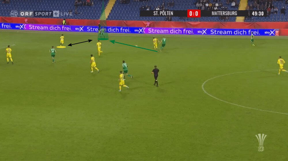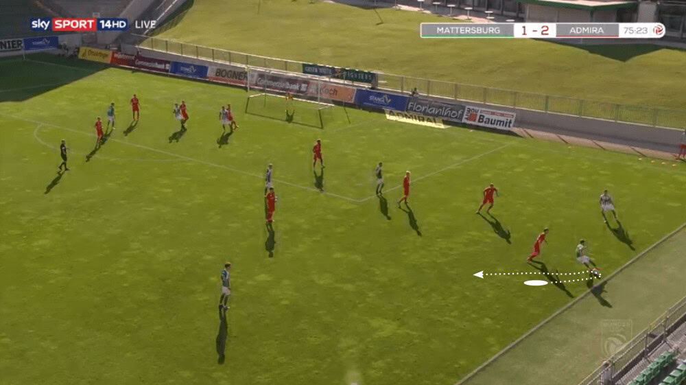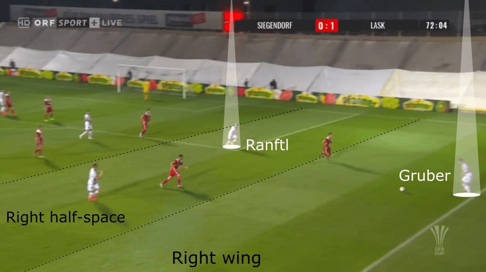 More important than strictly occupying the half-space is that the wingers should communicate and work together with the wing-backs. They mustn’t be positioned in the same vertical zone to avoid that they limit their options. Therefore, when the wing-back (on the right side mainly Reinhold Ranftl) moves into the half-space, the winger has to move out to provide the necessary width. We can see an example below as Gruber does exactly that.