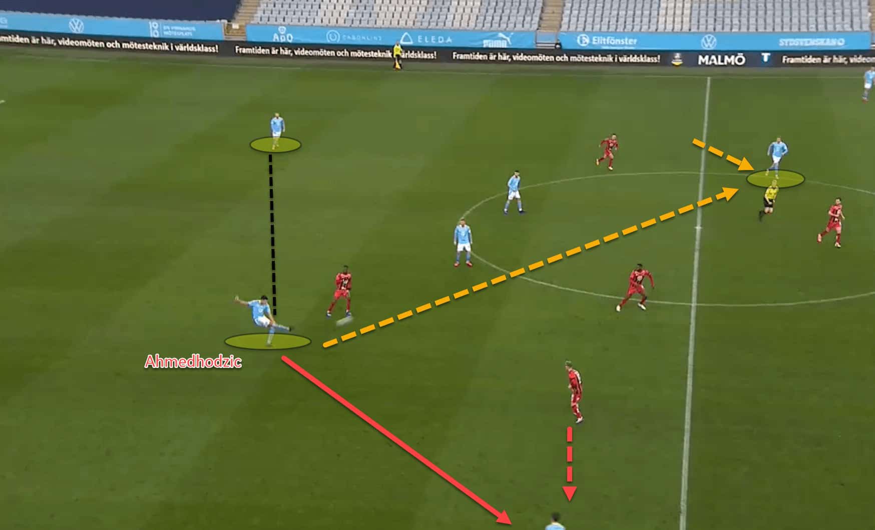 As Malmo tends to push their fullbacks high when they are in positional attacks, Ahmedhodžić is tasked with pushing across and covering the wide areas, which he does rather well, which we will go into further detail with.