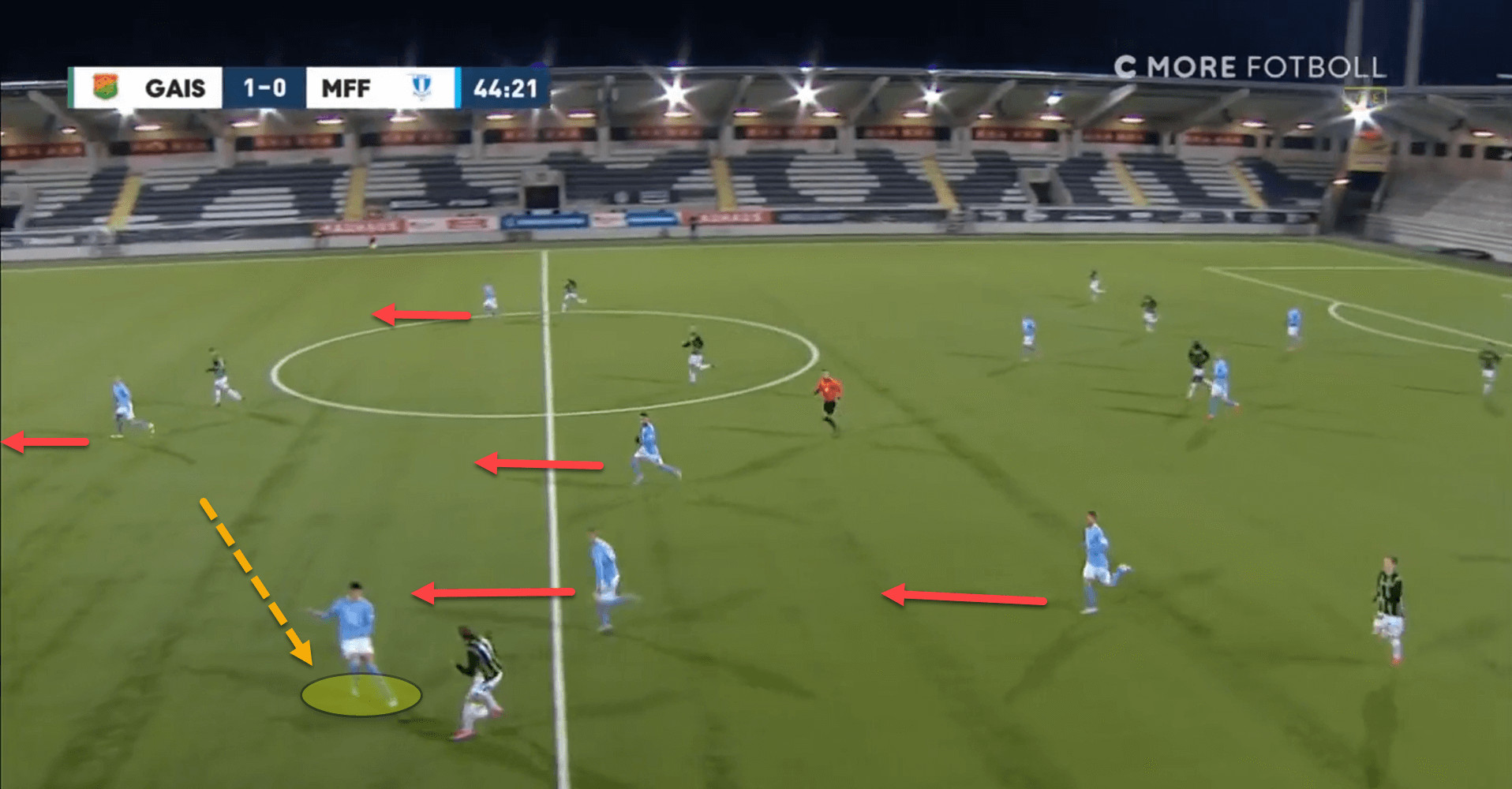 As we can see from this image, GAIS have blocked or are tight to all the nearest passing lanes and so Ahmedhodžić decides to switch the play quickly rather than play backwards and try to invite the opposition to come out and press.