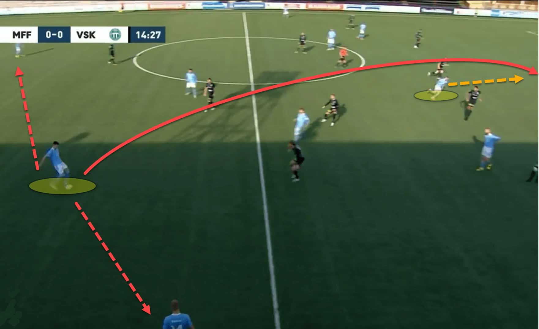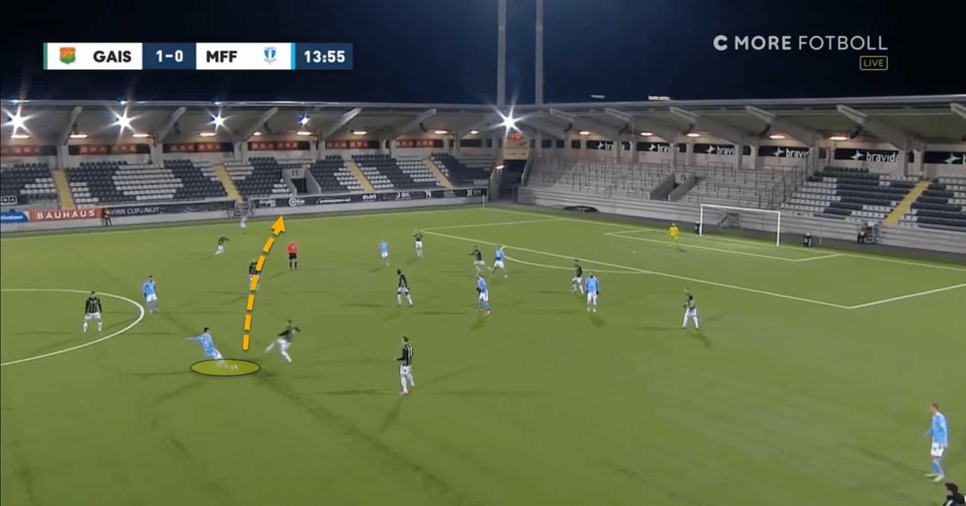 When a team struggles to play through an opponent’s defensive structure, having a central defender who can switch the ball and stretch the opposition vertically and horizontally to create space is crucial. This is what the Malmo defender gives his side.