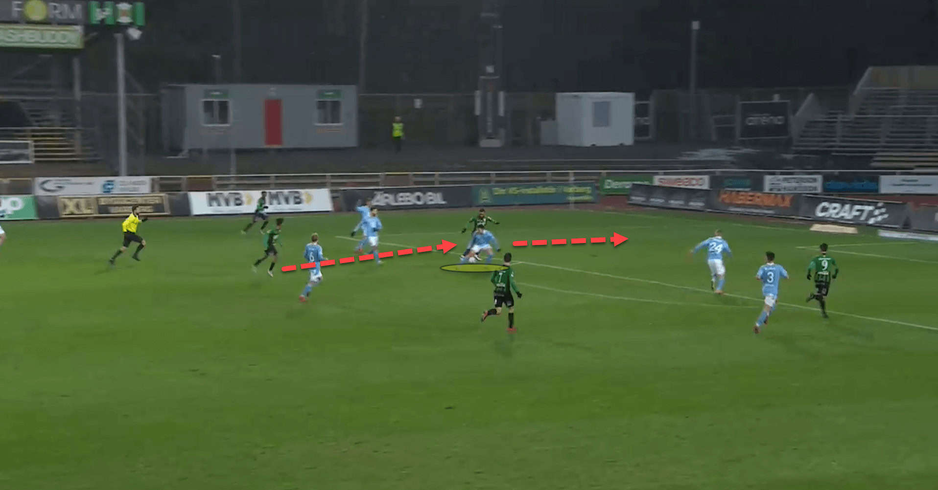 There are no short progressive passing lanes available, and there are only two risk-averse options, so the centre-back sees one of the Malmö forwards making a run in behind the opponent’s backline and decides to play over the top to success.