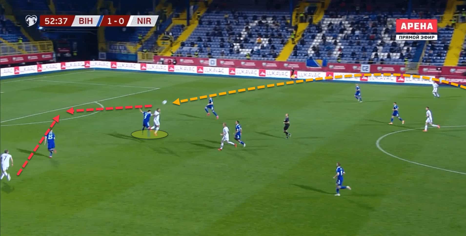 Again, we can see an example of Ahmedhodžić breaking through the opposition’s first line of pressure here when they are defending in a mid-block.