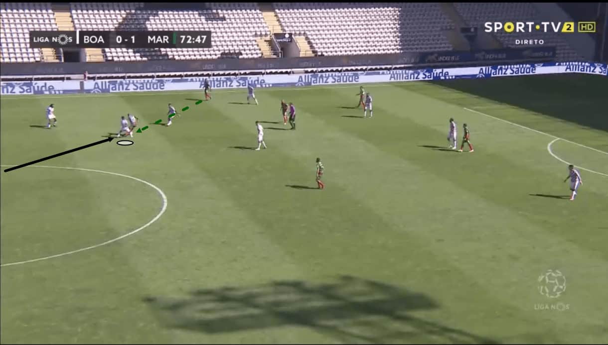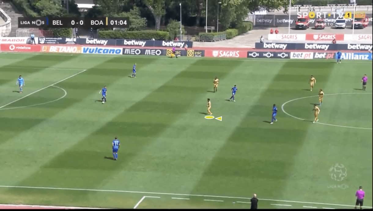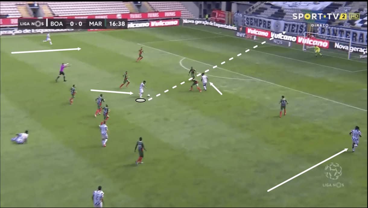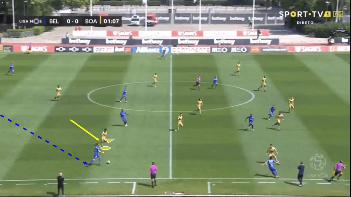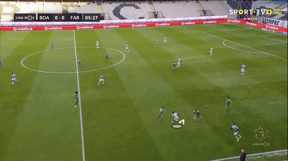 In this particular game, he was deployed in the left-sided centre-forward position, and just before this image, Boavista played the ball to the left wing.