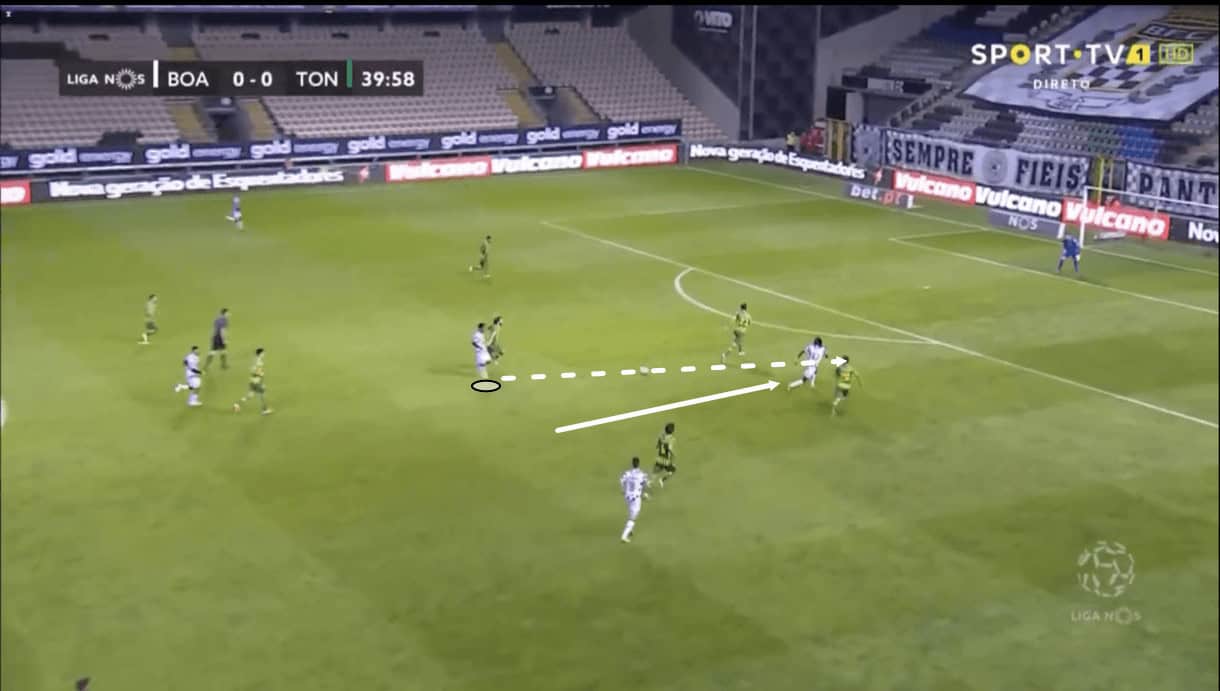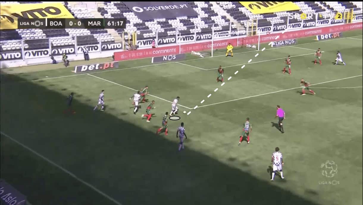 Thanks to his spatial awareness and his quality in one-touch moves like this and moves where he has more time to think, as seen earlier in this section, Gomes has played 1.68 through balls per 90 this term—more than any other Boavista player.