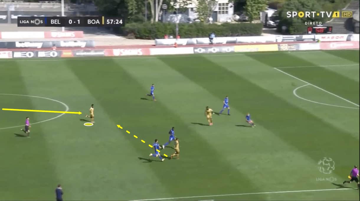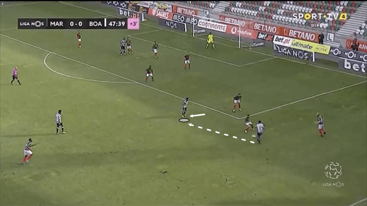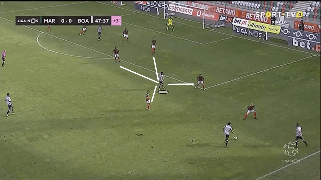It’s worth noting, however, that while the Boavista attacker presses the opposition right-back here, he ensures to angle his run to cut off the passing lane between the full-back and the right-sided central midfielder that he’s been covering the whole time.