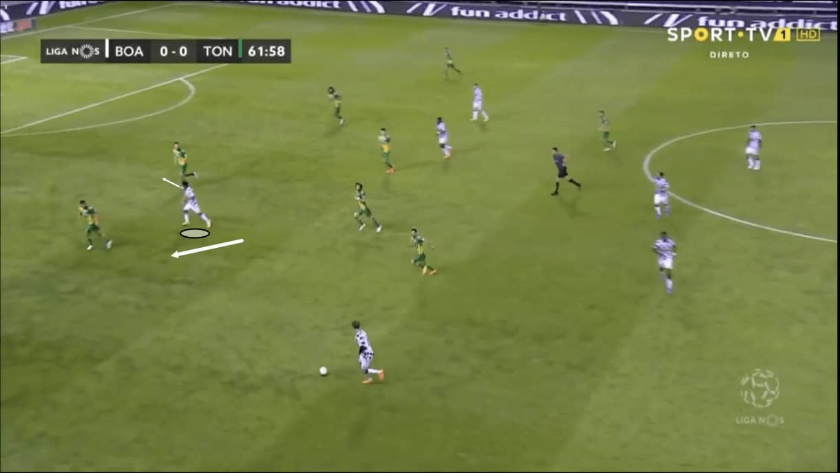 As play moves on, the Boavista loanee soars past the defender on the outside, continuing this attack down the wing.