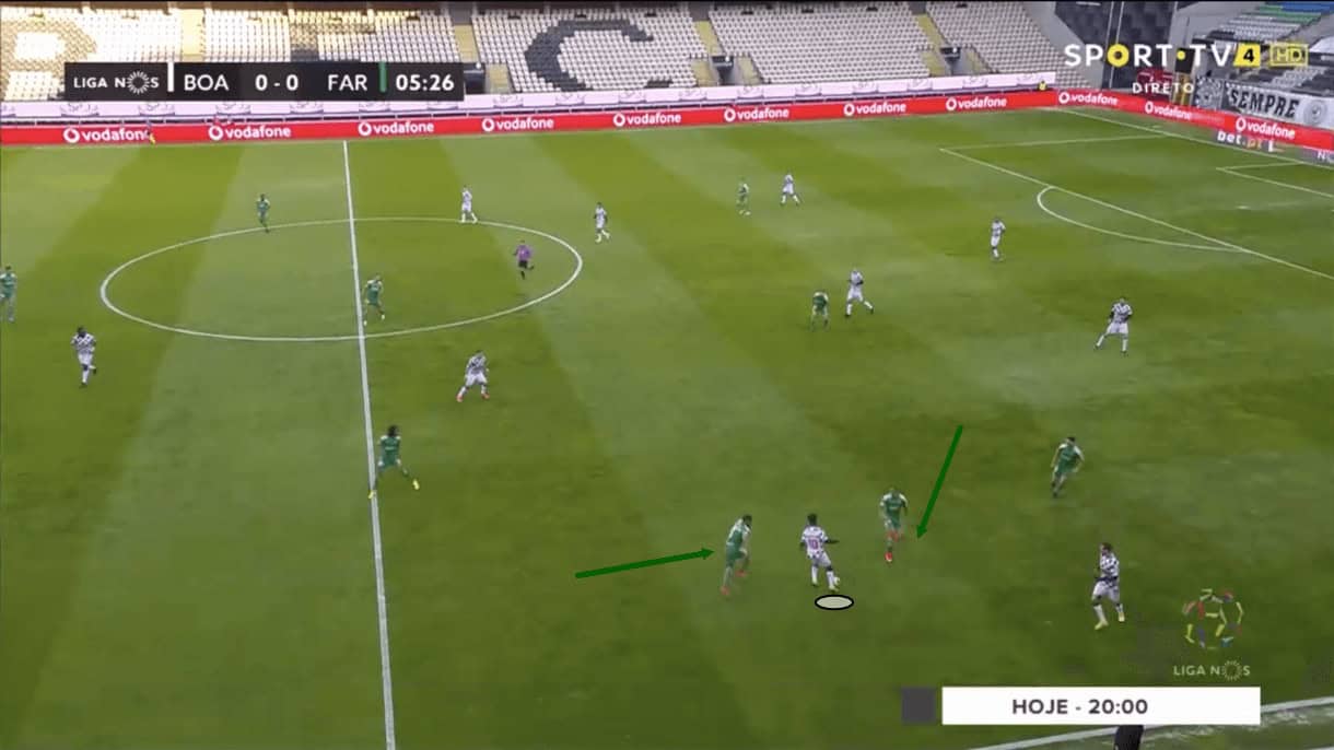 This is a better area to press for Boavista, thanks to the sideline limiting the area of play available to the right-back.