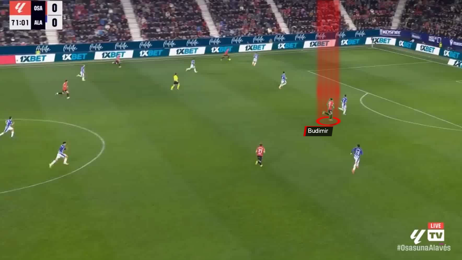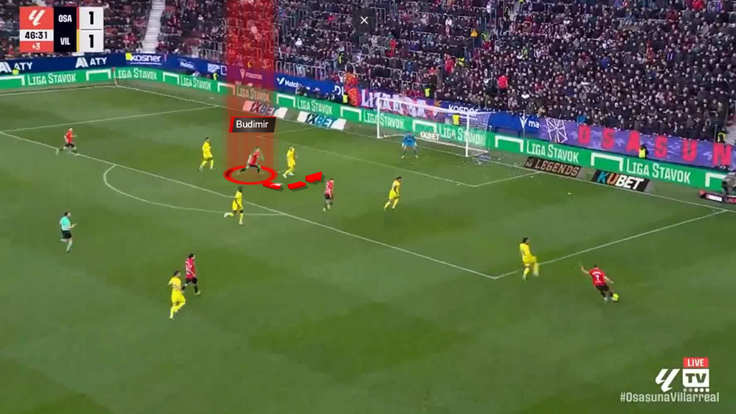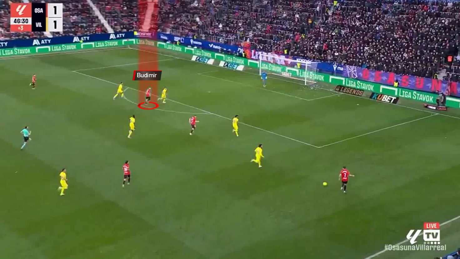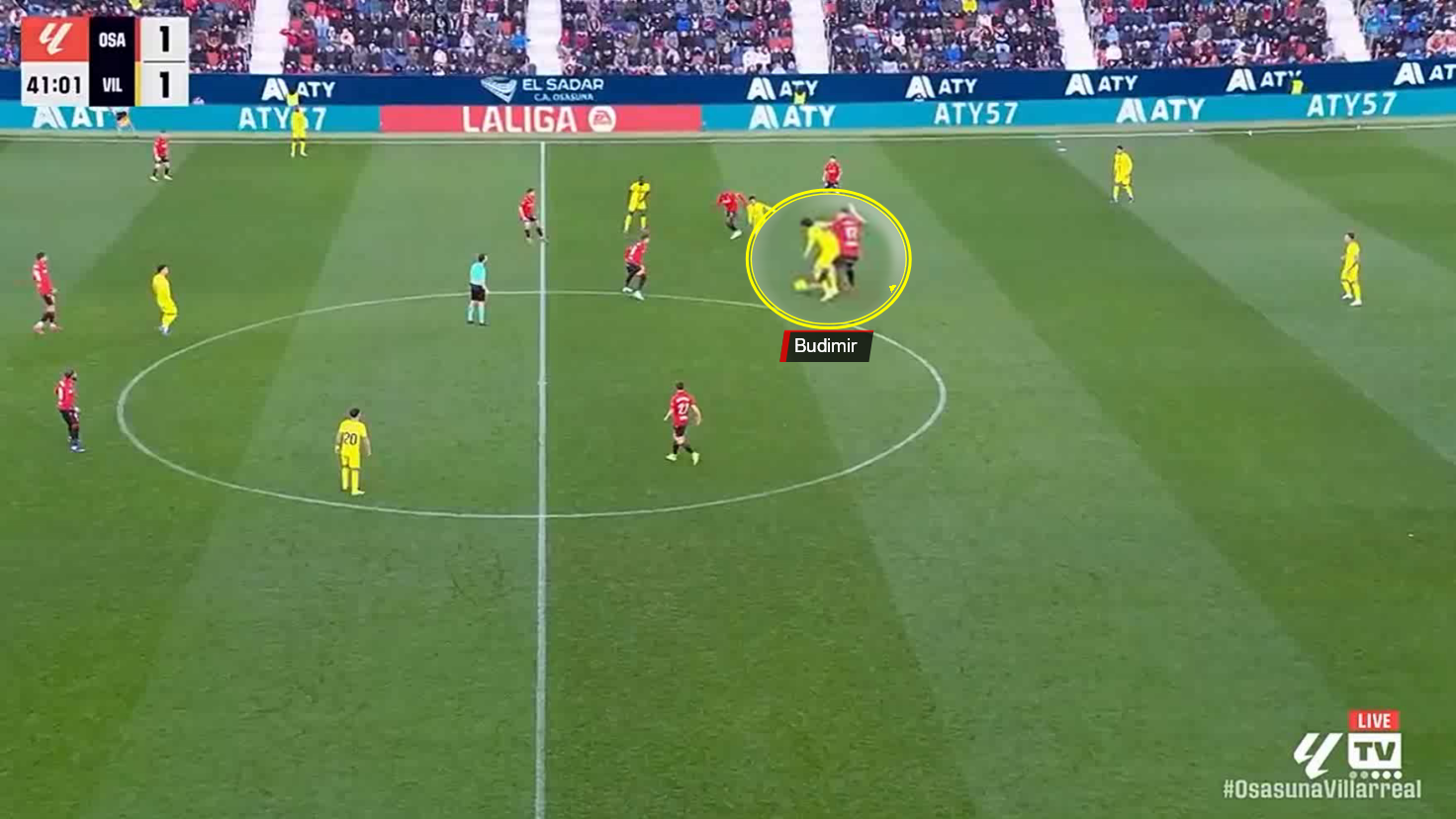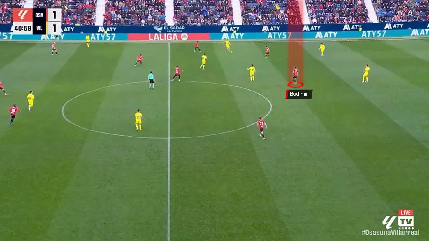 Here, against Villarreal, even after breaking through the first line of pressure while searching for the midfielder, Ante Budimir drops back to press and win back possession.