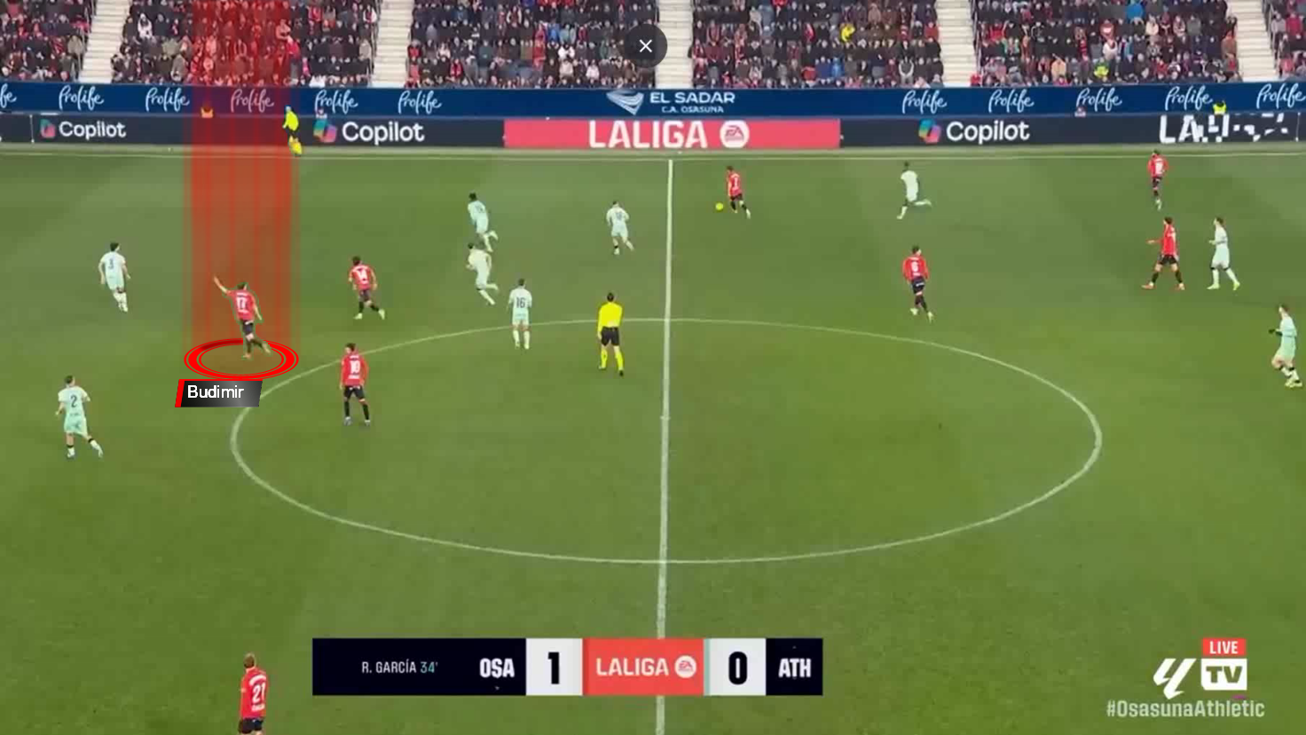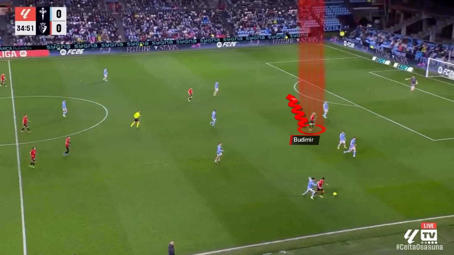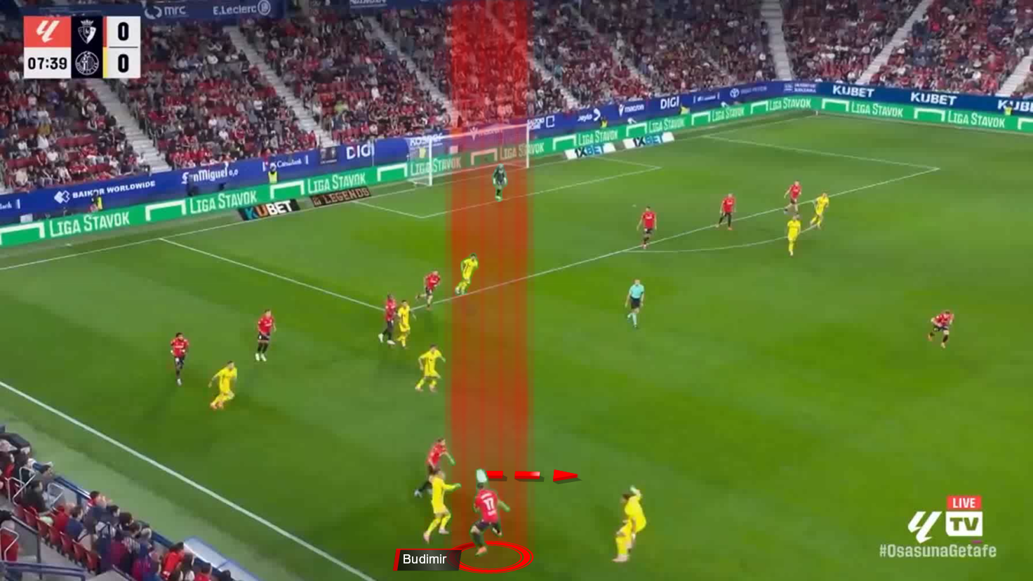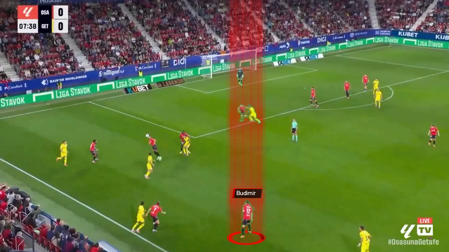 Here, against Villarreal, even after breaking through the first line of pressure while searching for the midfielder, Ante Budimir drops back to press and win back possession.