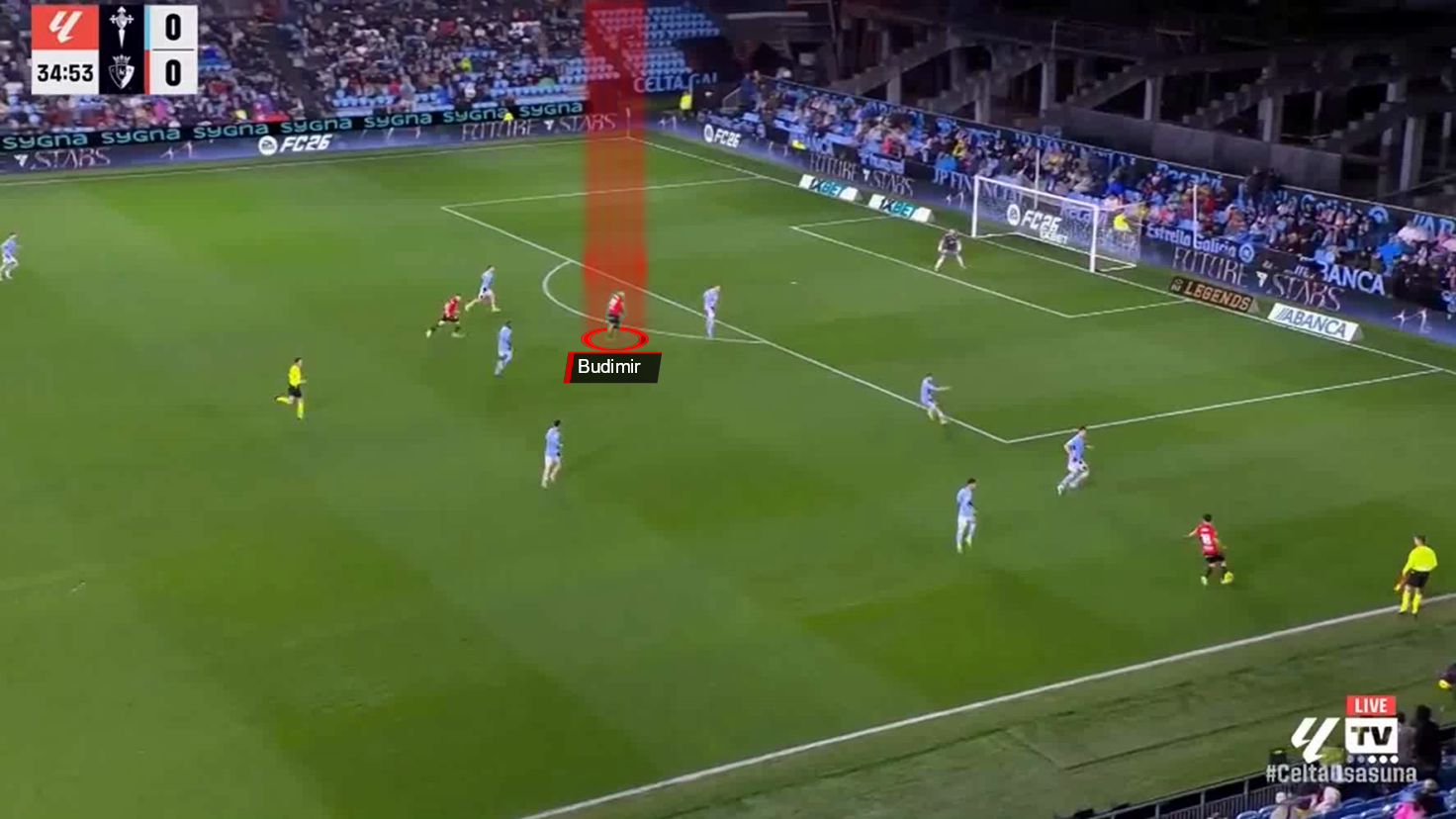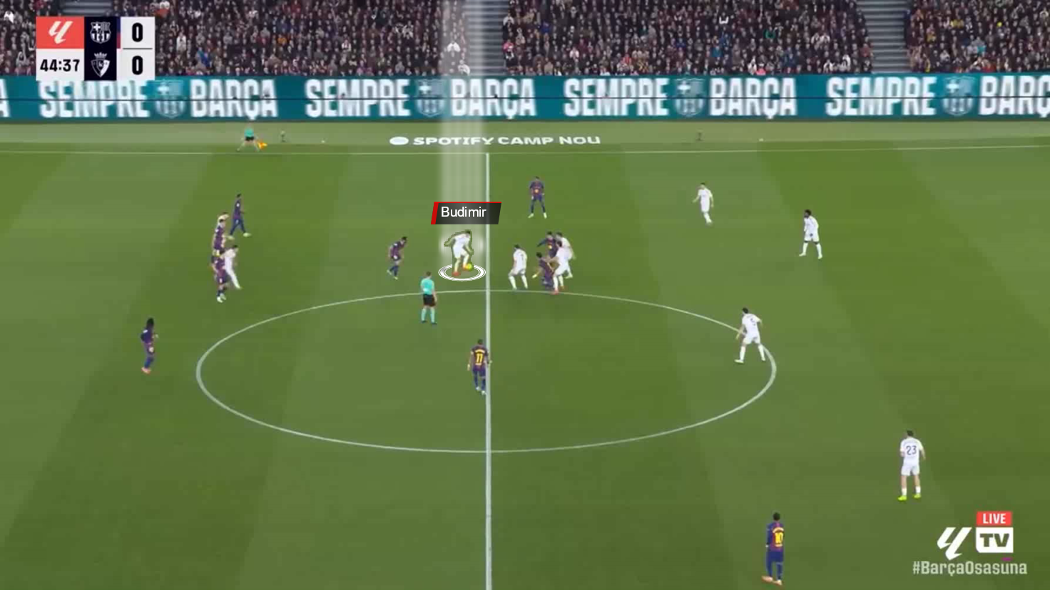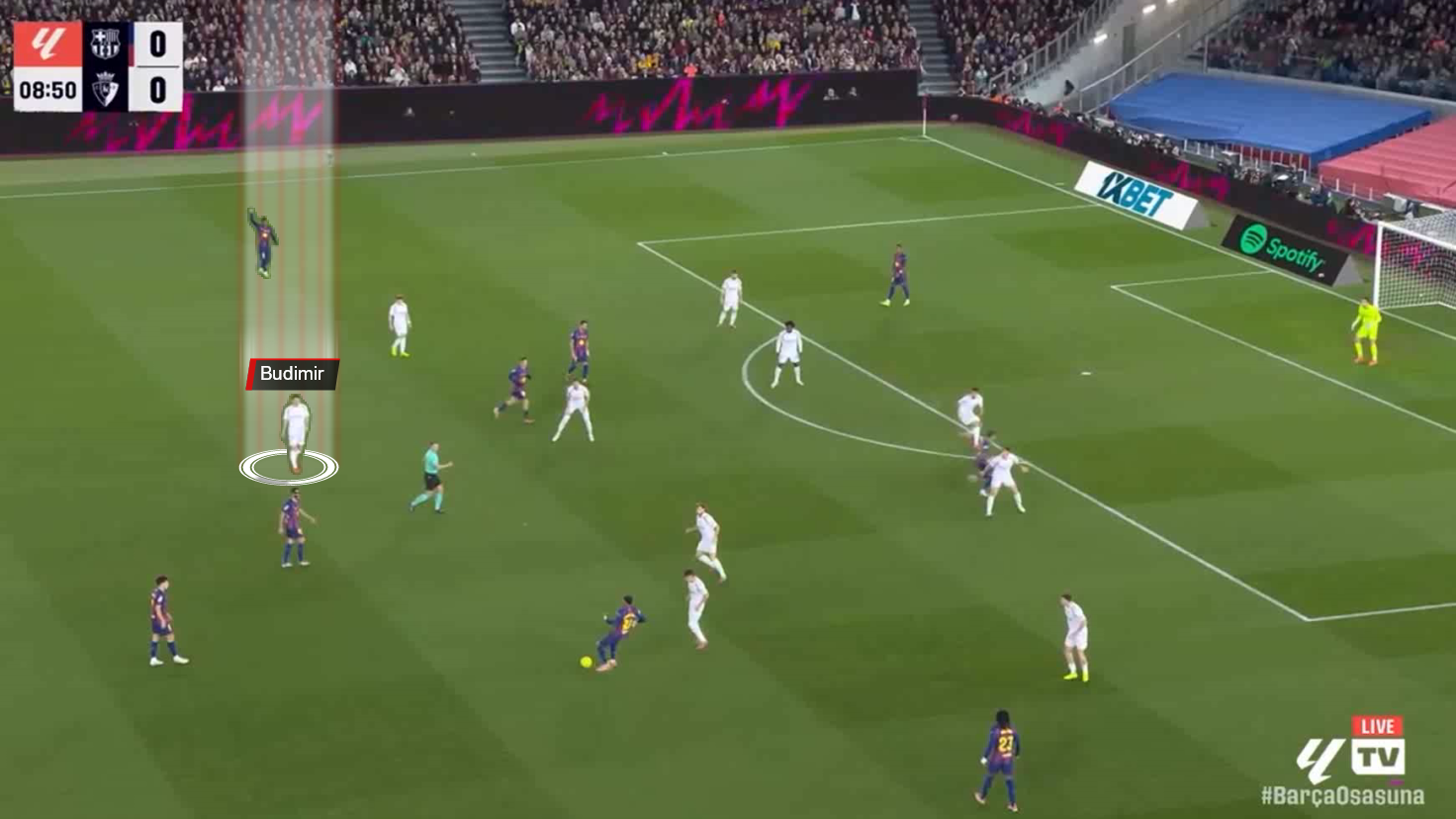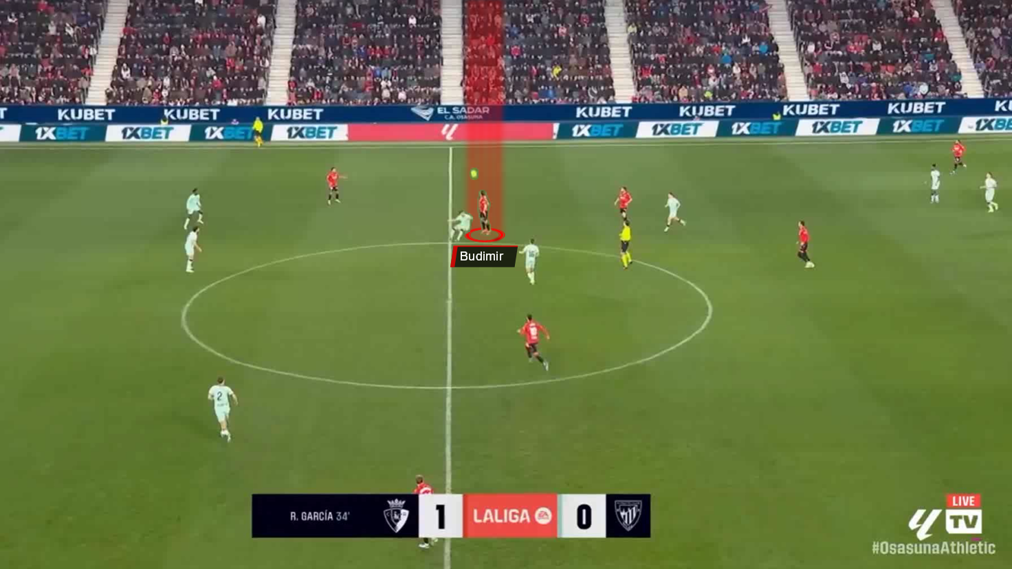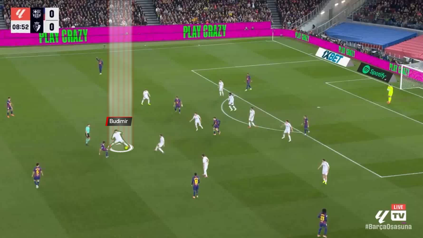 Here, against Villarreal, even after breaking through the first line of pressure while searching for the midfielder, Ante Budimir drops back to press and win back possession.