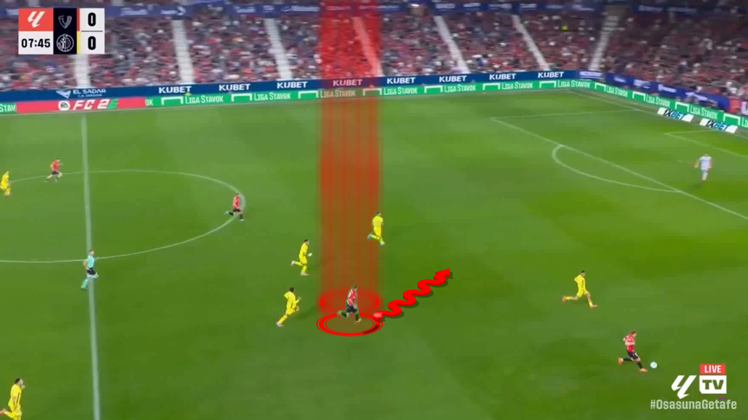 Here, against Getafe, we can see Ante Budimir’s potential to help the team relieve pressure and execute a quick counterattack by dropping back and playing a header into the space behind the defender marking him.