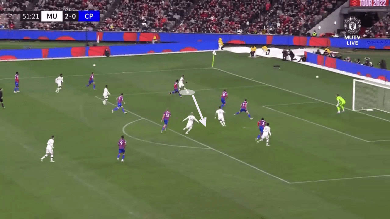 By doing this in ten Hag’s 4-2-3-1 system the ’10’ would be able to make a run from deep into the space created by Martial dropping deep. Bruno Fernandes is intelligent enough to develop this relationship and understanding with Martial and is definitely something that could happen.