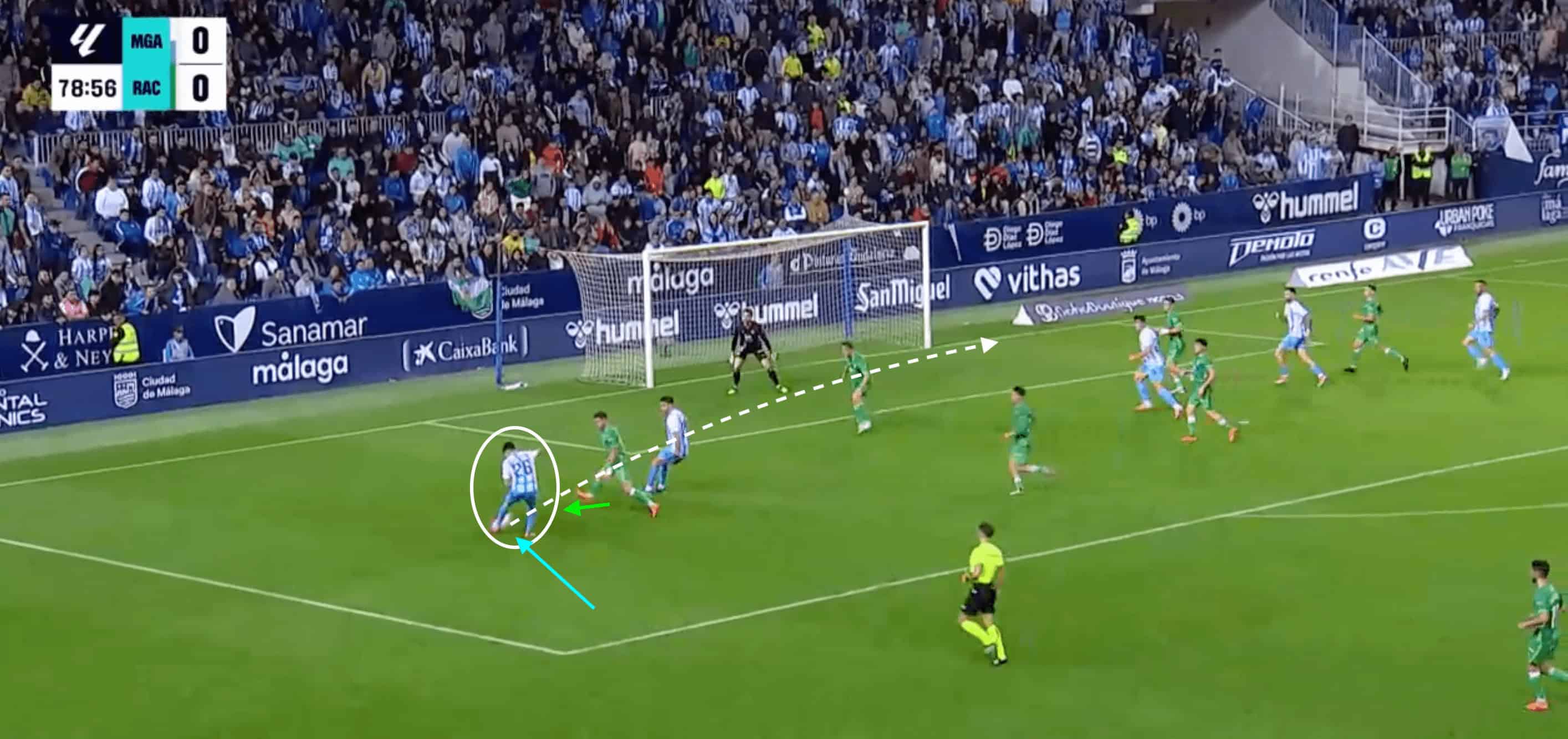 This was evident in their match against Racing Santander, where the 18-year-old found himself in an excellent position to slide the ball inside to a runner through the centre, taking advantage of Málaga’s 4v3 inside the box.