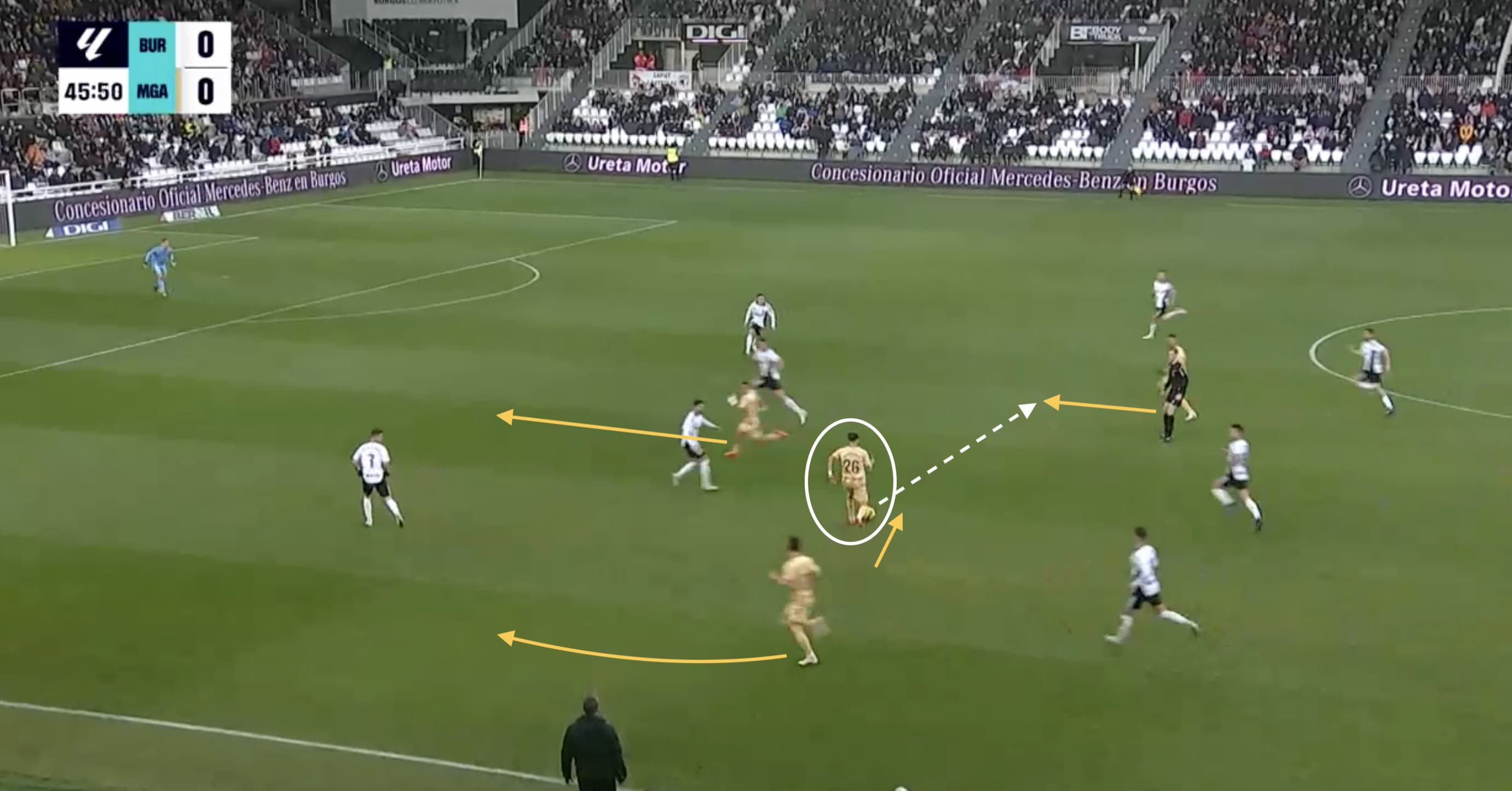 Take, for example, this attacking sequence against Burgos, in which we saw Málaga’s 4-4-2 having an opportunity to attack in transition.