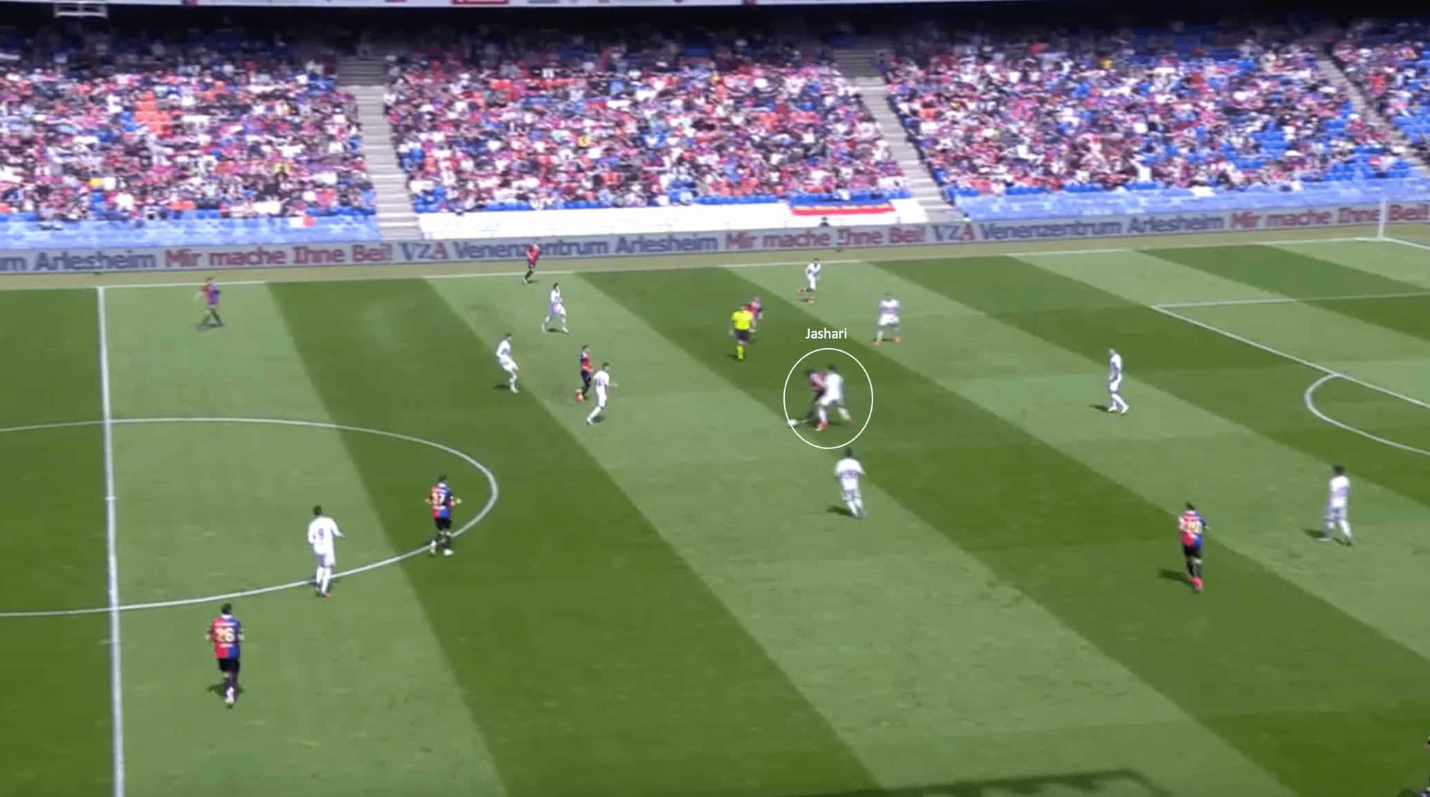 This slight error is what Jashari is able to take advantage of, with the Swiss international able to win possession and start his side off on a counterattack.