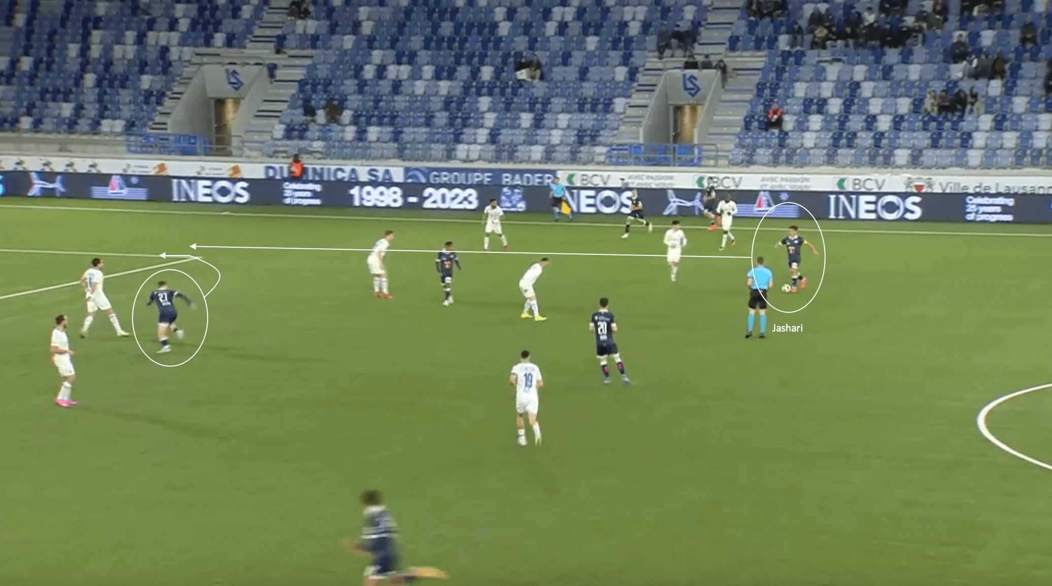 Jashari is able to spot the run on the weak side of the winger, with the opposition fullback trying to step up to trigger the offside trap.