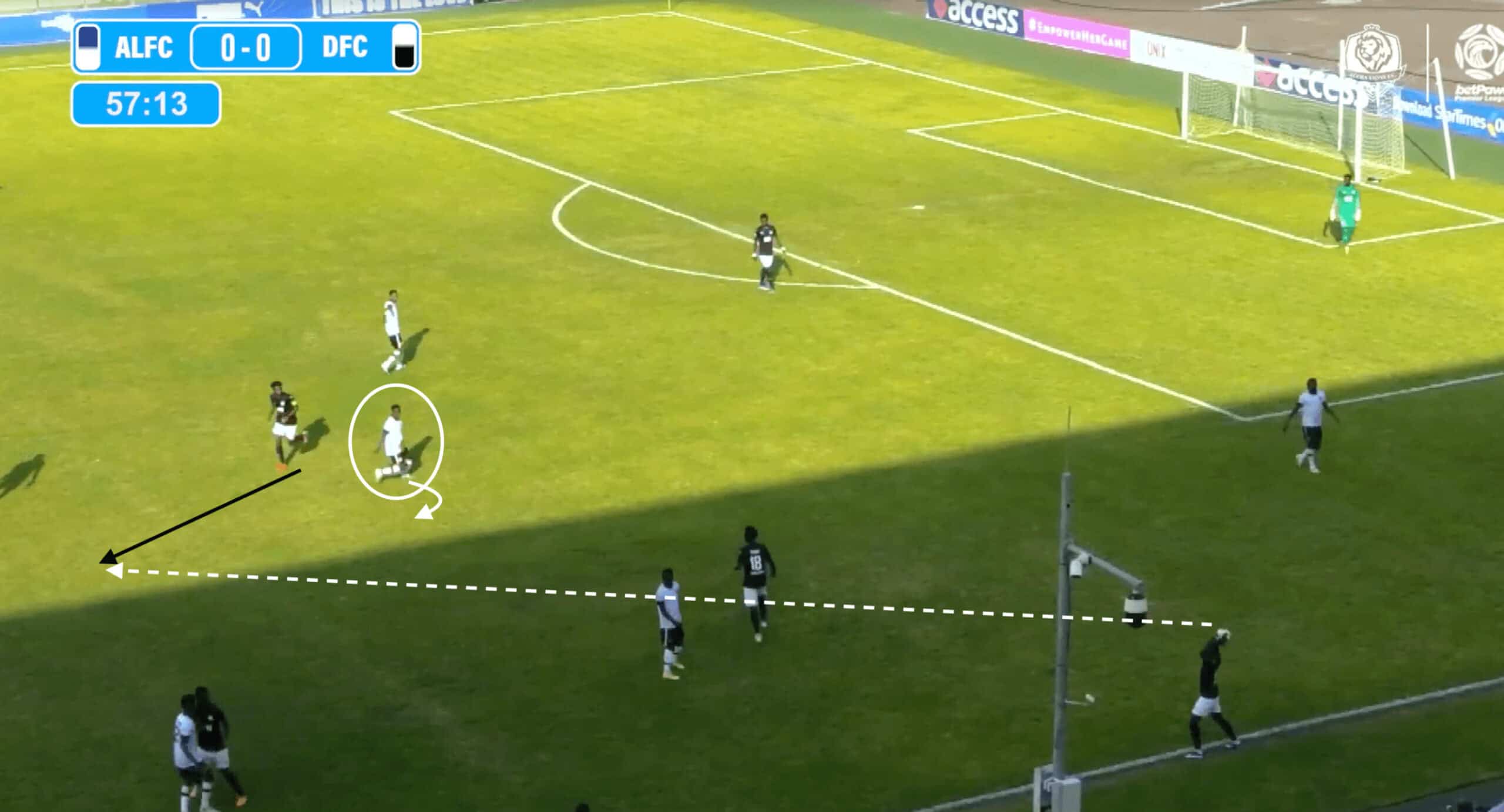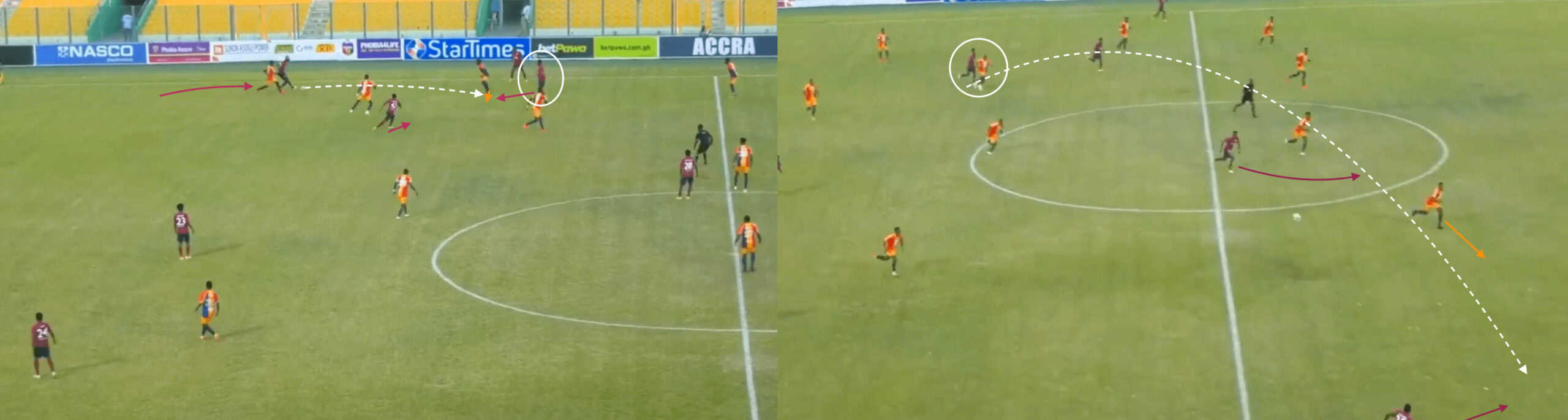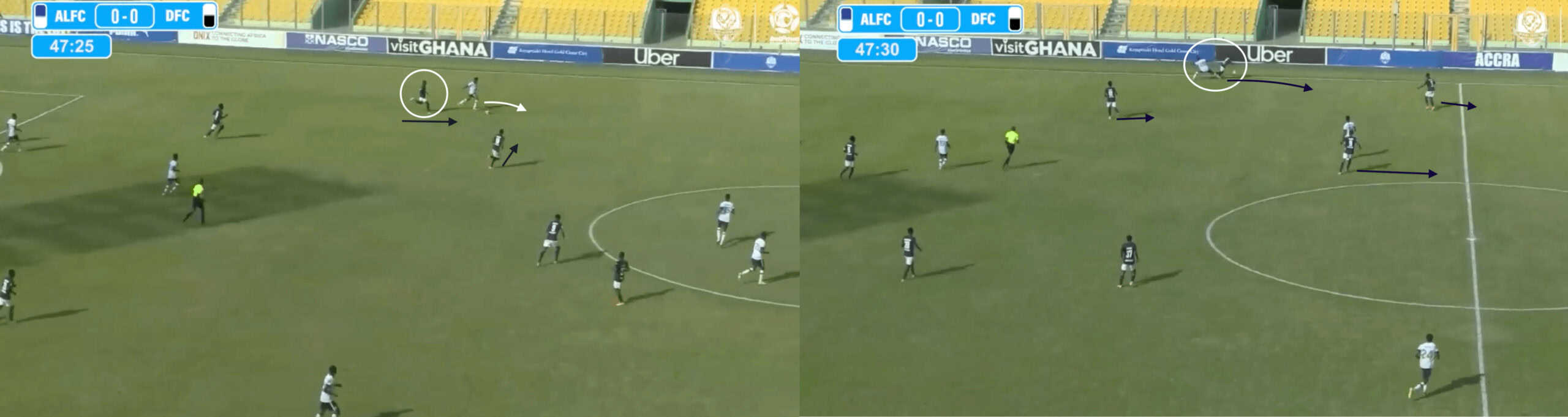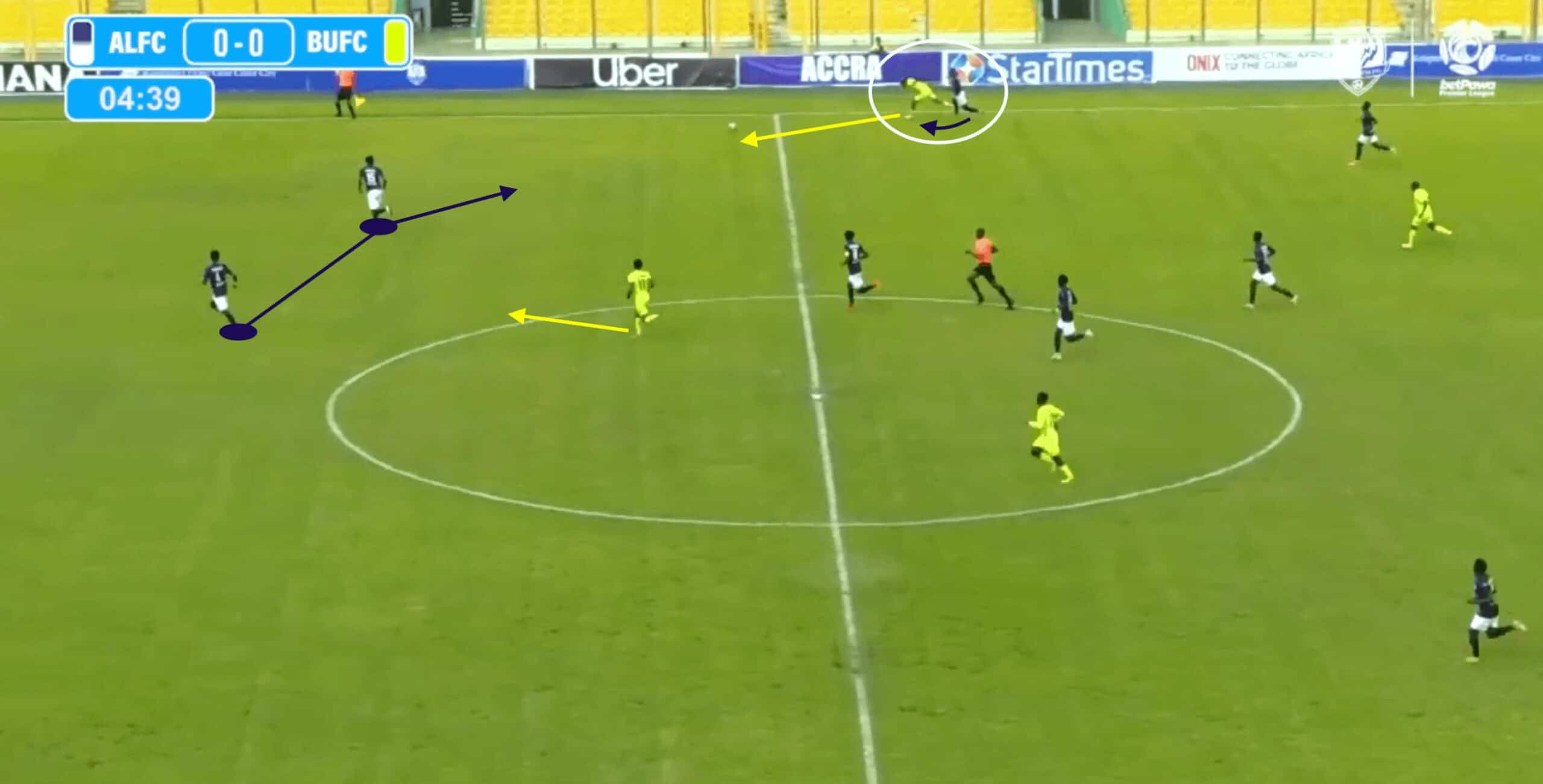 This allows the Accra Lions to progress the ball along the flank with their central defender initially and provides an excellent passing outlet to split the lines.