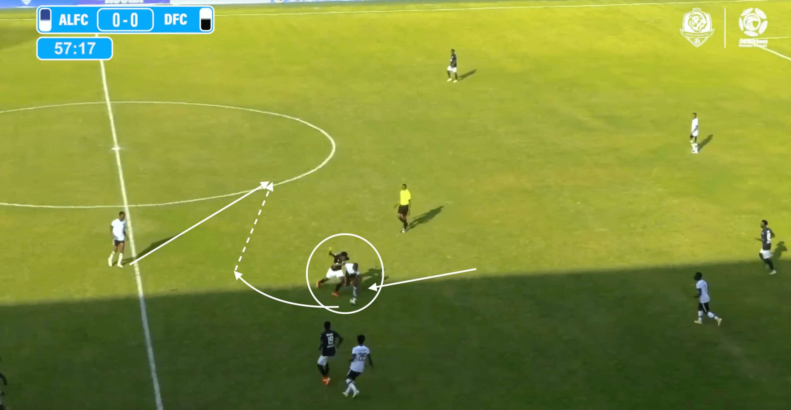 A perfect example of Issah’s ability to be effective with his off-the-ball intelligence would be when Dreams FC were taking on Rivers United, as we see the midfielder looking to patrol the right half-space to connect play with the right flank.