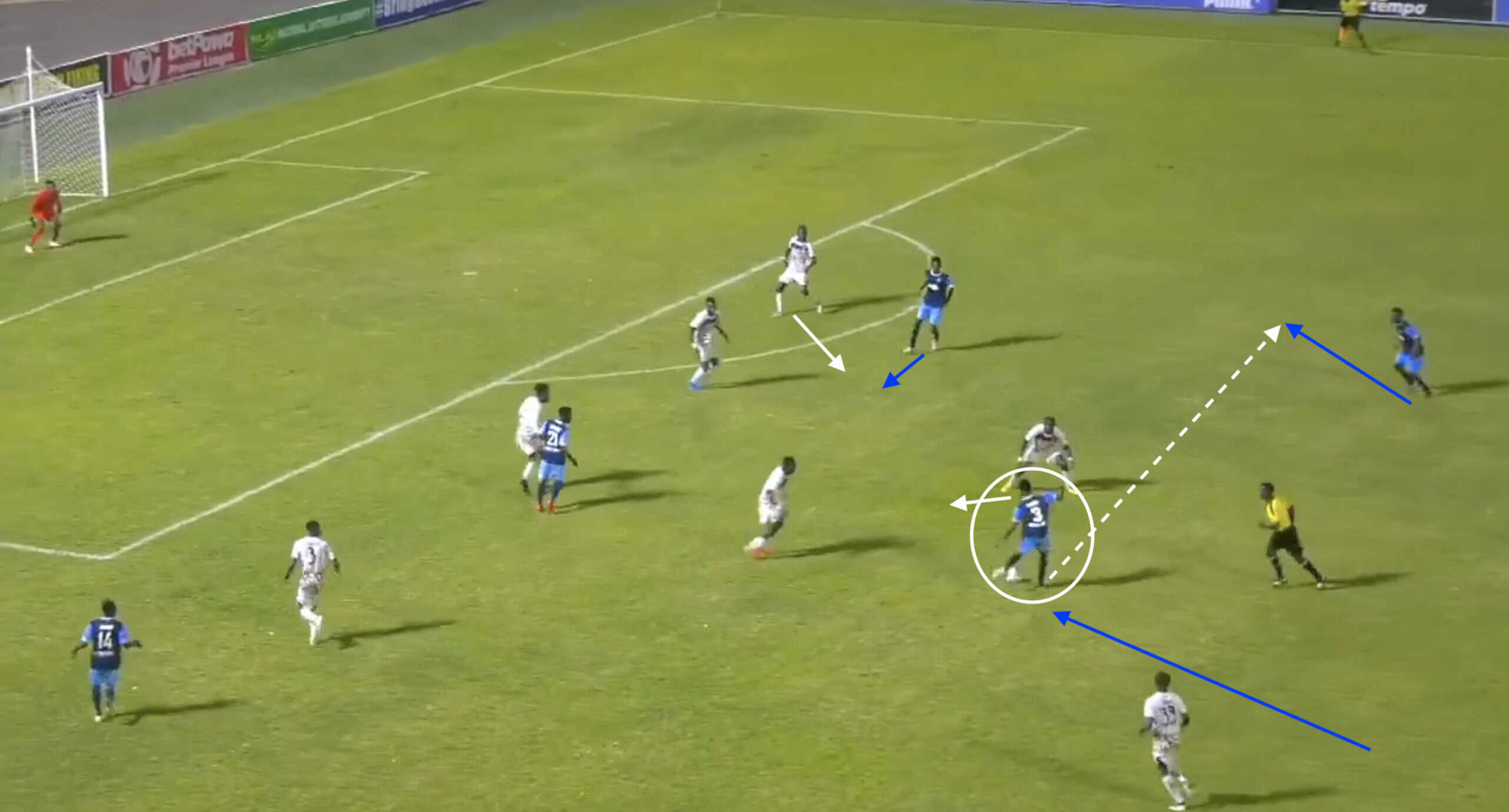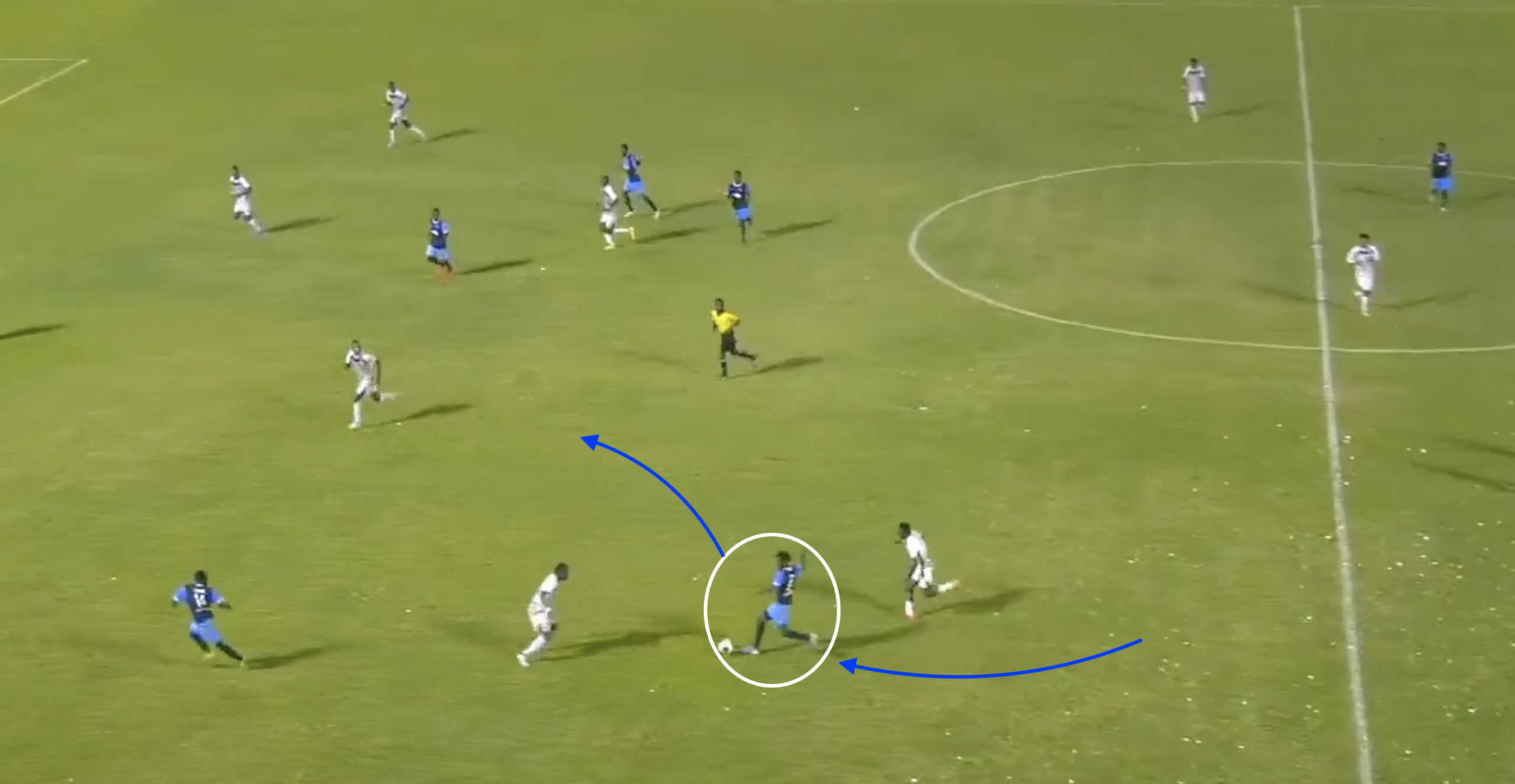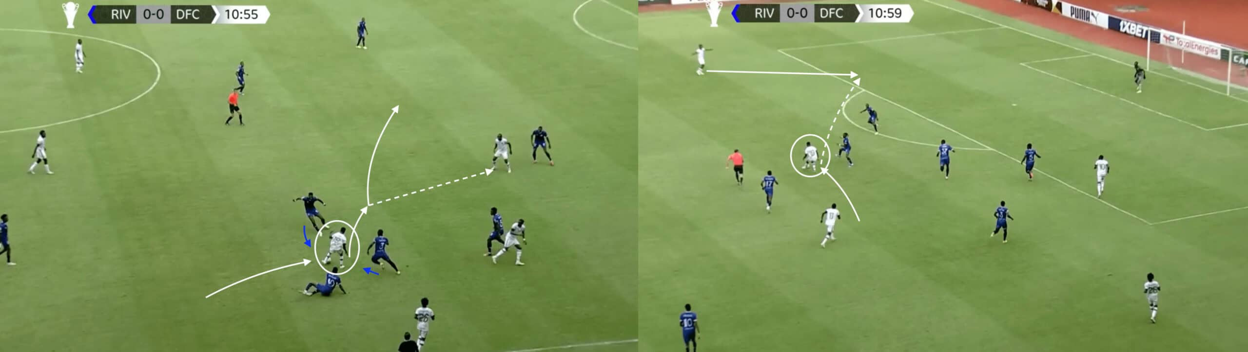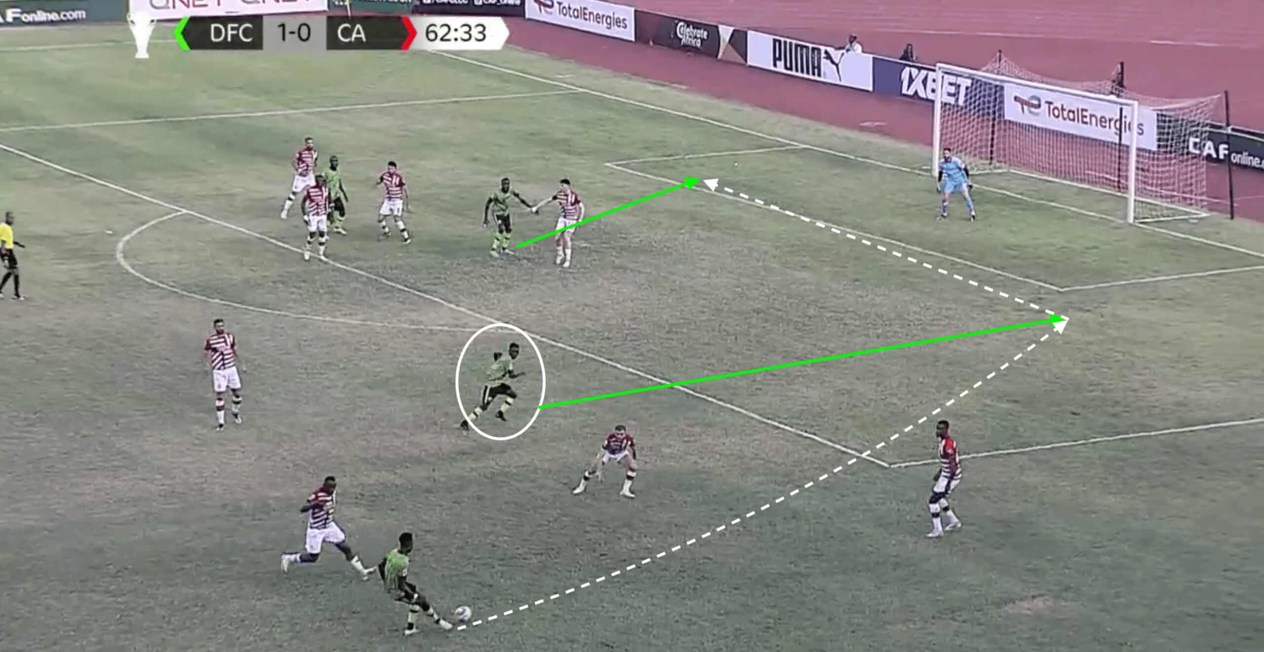 As the sequence progresses, Issah is able to draw the defender out before bursting into space to receive the through ball behind the Rivers defensive line.