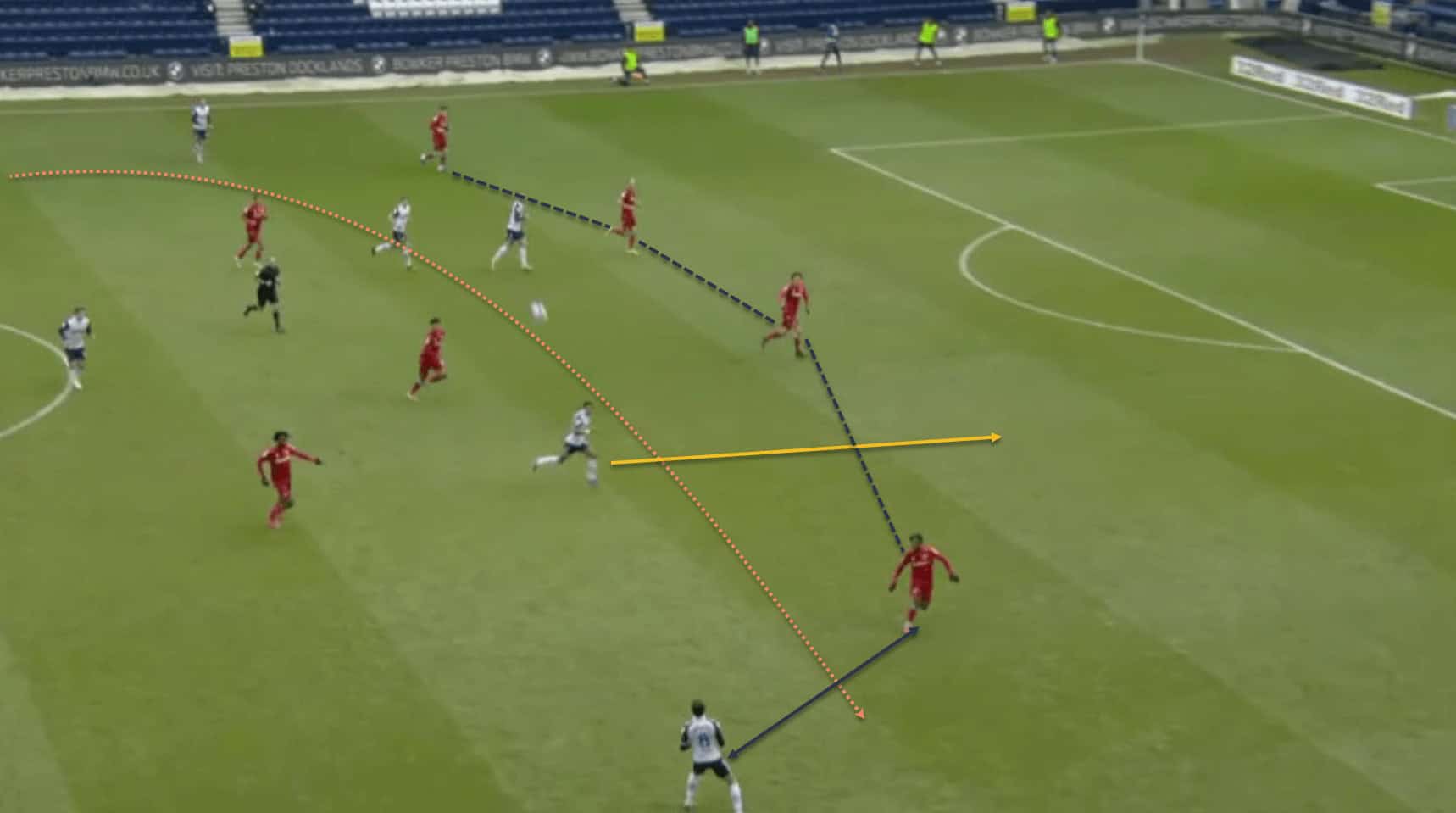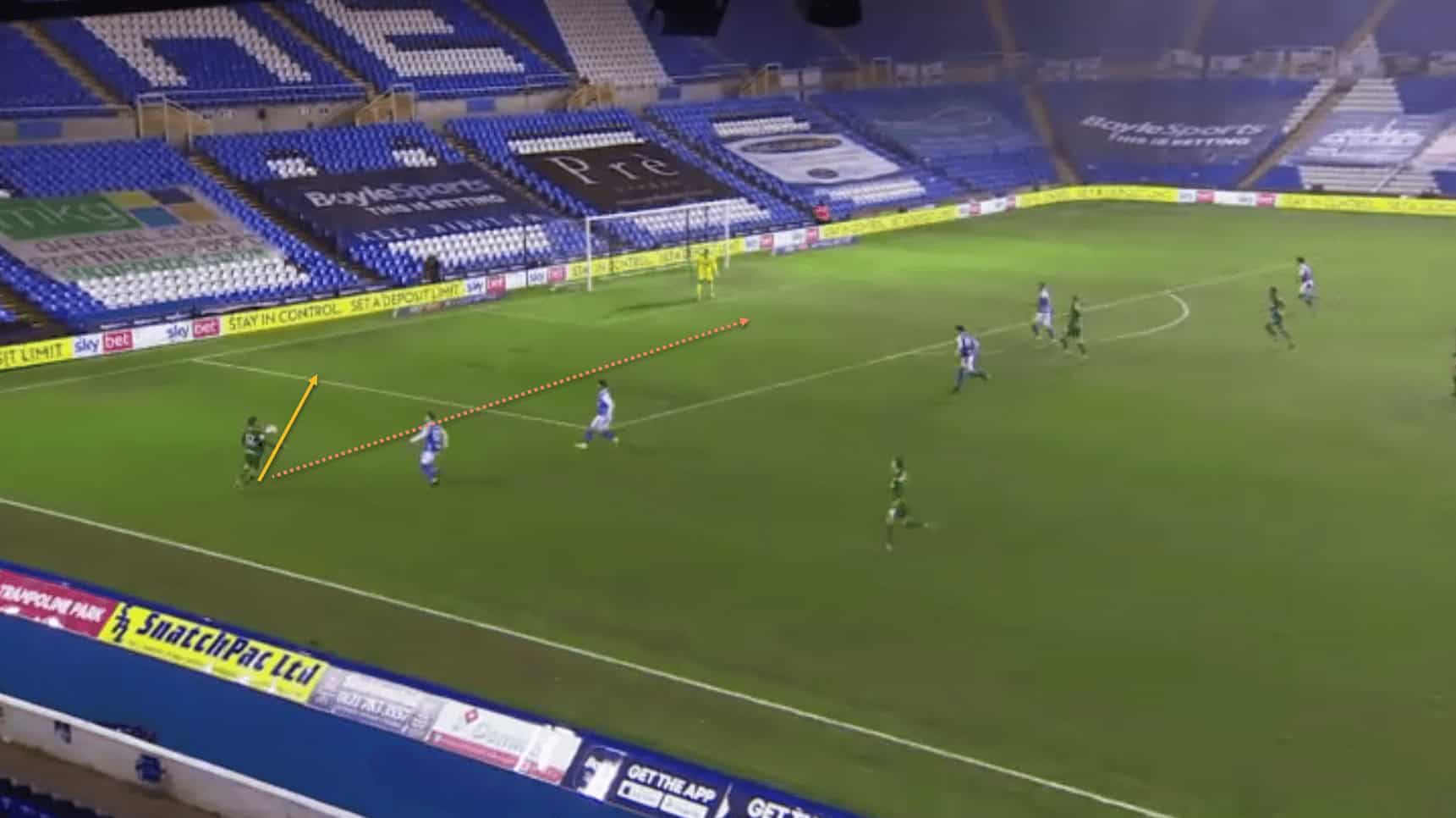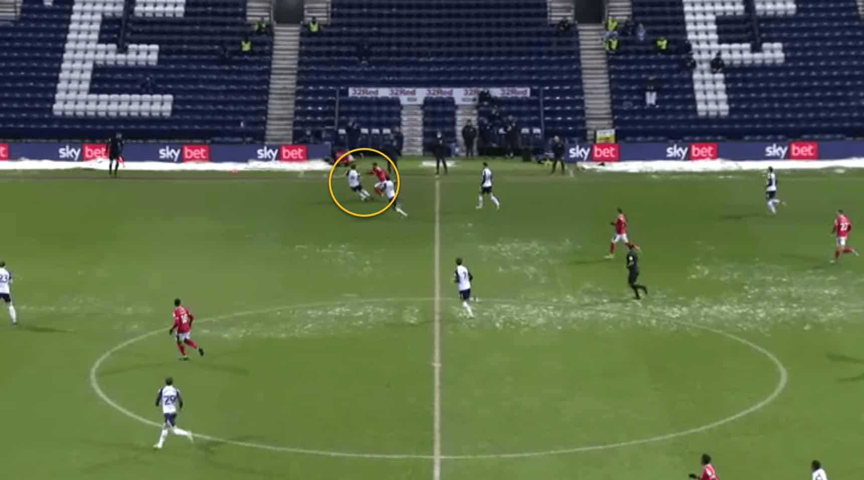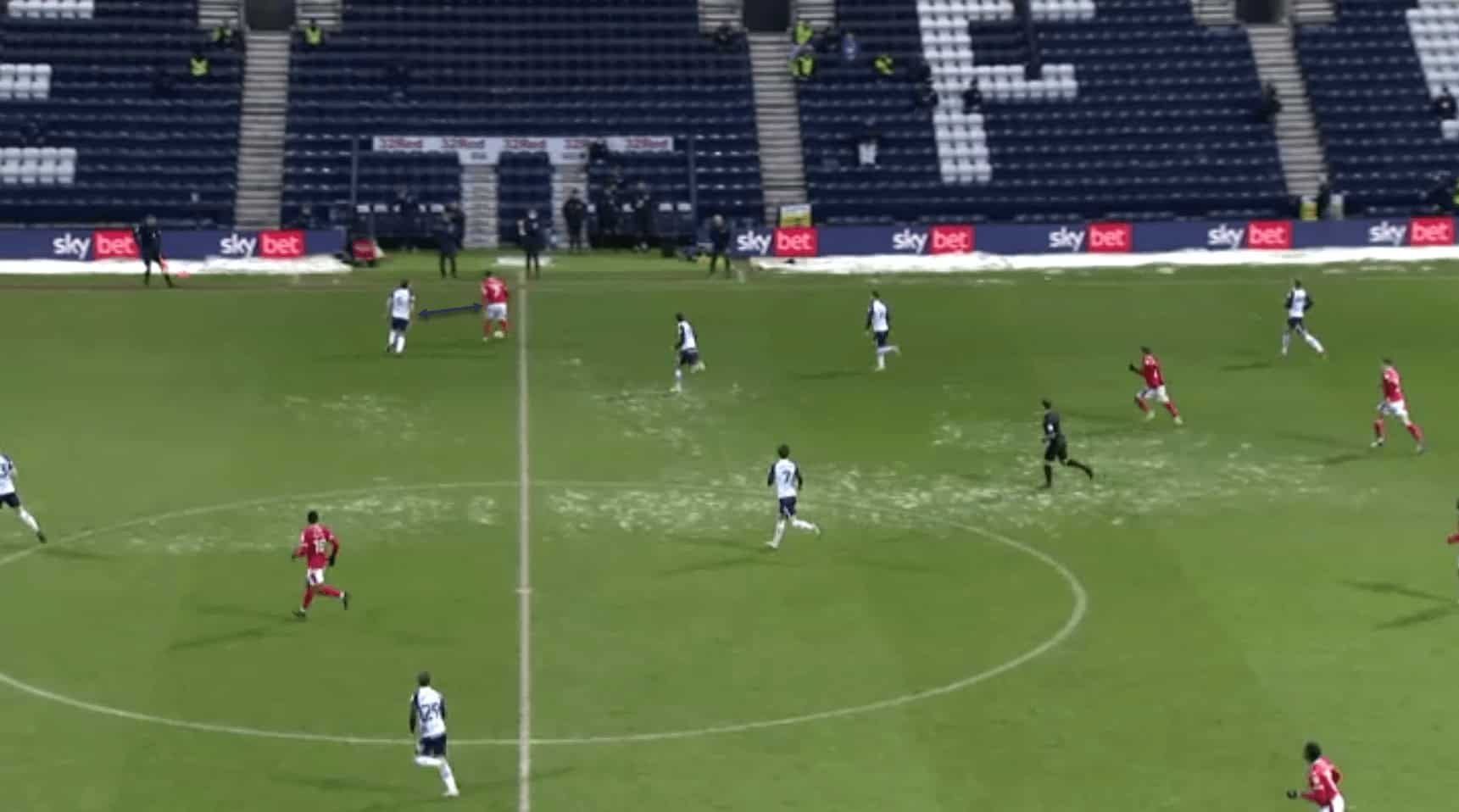 …where his teammate is able to receive the ball in space. Also note how the opposition left-back, in sprinting out to cover the space, is leaving a huge gap in behind for the Preston midfielder to run into, which could be exploited if the right pass is made.